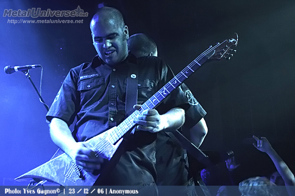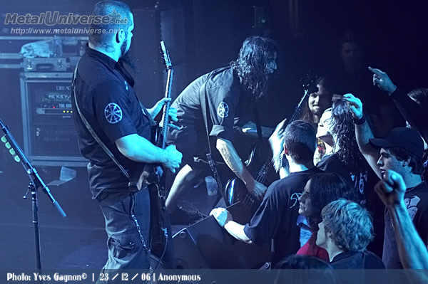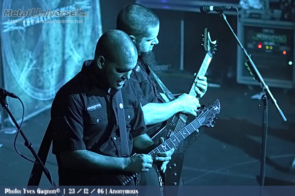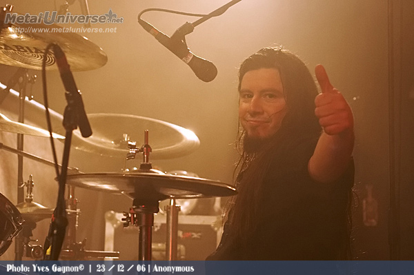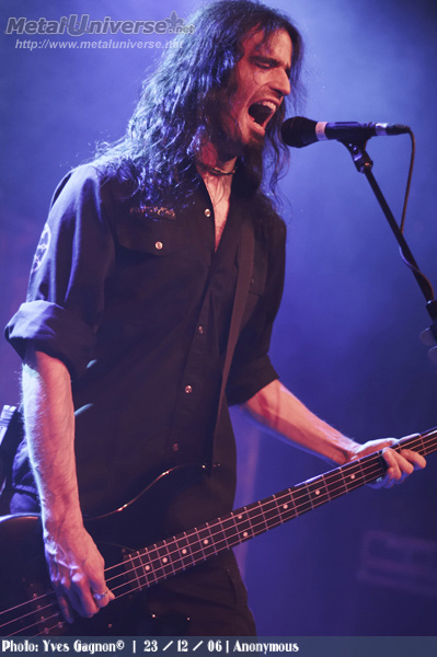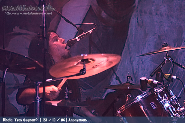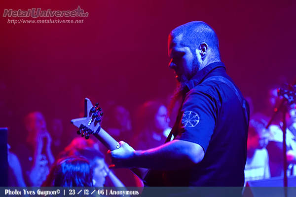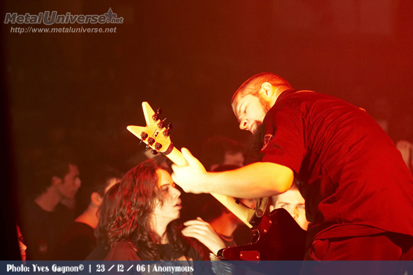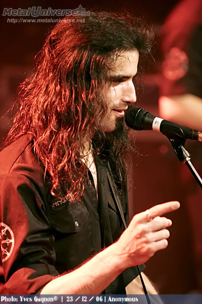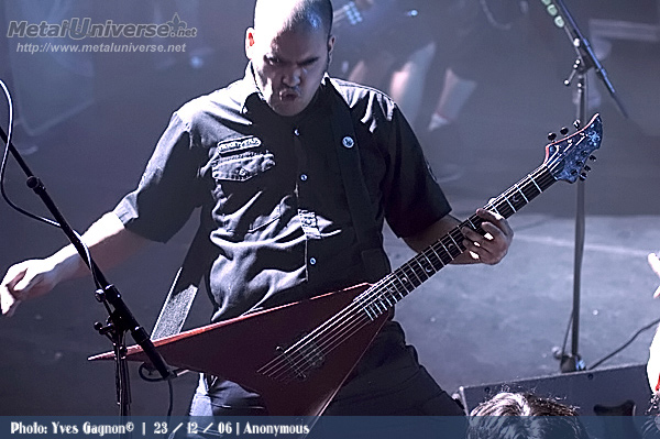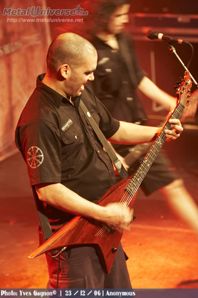 Les grands du metal québécois Anonymus finissaient donc la tournée promotionnelle de leur album « Chapter Chaos Begins » dans la ville de Québec. C’est leur premier disque depuis le départ de Marco Calliari. La première observation qui m’est venu à l’esprit lors du spectacle c’est que l’album est beaucoup plus rapide que les précédents, moins heavy et 100% thrash. En misant de cette façon tout sur la vitesse, les nouvelles pièces sont donc beaucoup moins accrocheuses. Ç’a donc été difficile d’embarquer dans leur monde puisque le spectacle commença avec trois pièces du dernier album. Toutefois, à partir de l’excellente « Virtualliy Insane », le party commença véritablement. Les excellents solos de Daniel Souto se succédèrent de même que les blast-beats de Carlos Araya. Les meilleurs moments de la soirée ont été sans aucun doute la dernière pièce « Que le diable m’emporte », à la fin on en redemandait, et « Prosternez-vous ». Fidèles à leur habitude, pour cette pièce ils invitèrent une personne de l’assistance pour chanter. Sa performance a été plus que bien. De plus, le chanteur Oscar Souto interagissait beaucoup avec la foule demandant fréquemment au public si ça allait et critiquant le confort illusoire de notre société. Donc, un excellent party de Noël même si nous n’avons pas eu leur version des « Anges dans nos campagnes ». Ceux qui croyaient que le départ de Marco affaiblirait Anonymus se sont trompés royalement. Ils sont toujours aussi intenses et violents, dans leur musique.