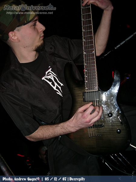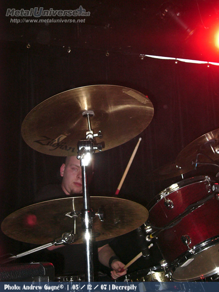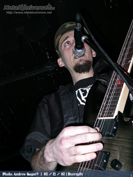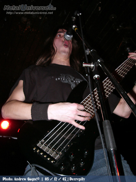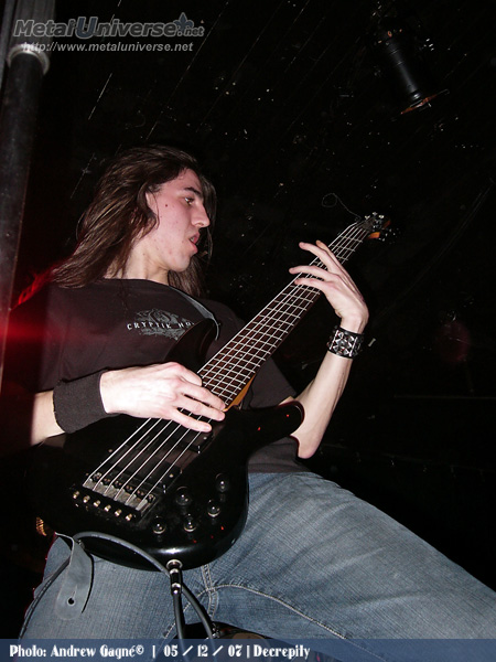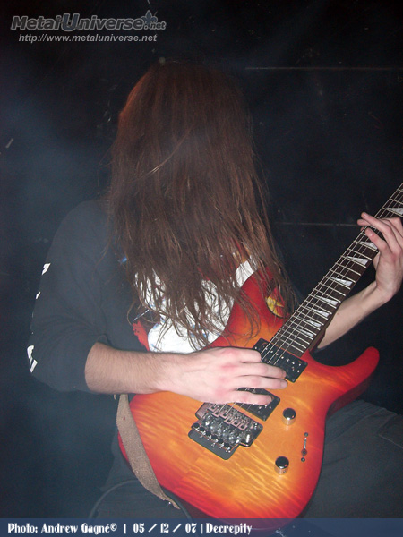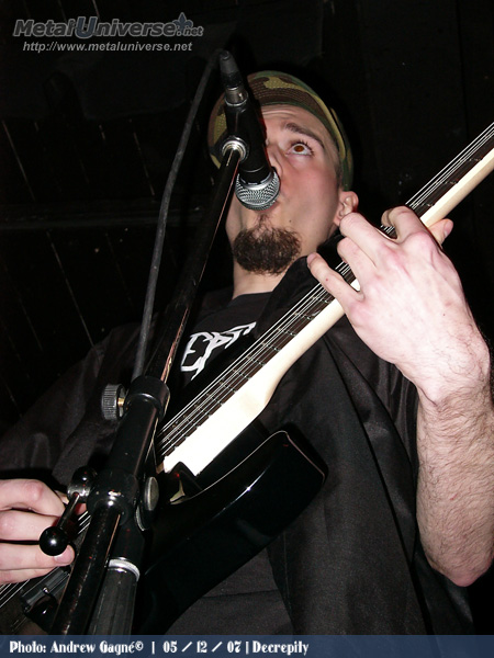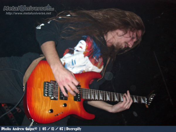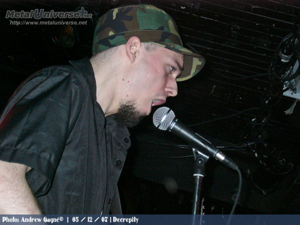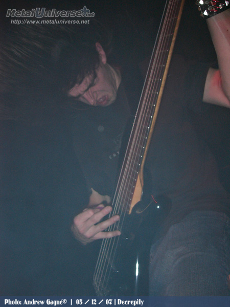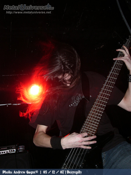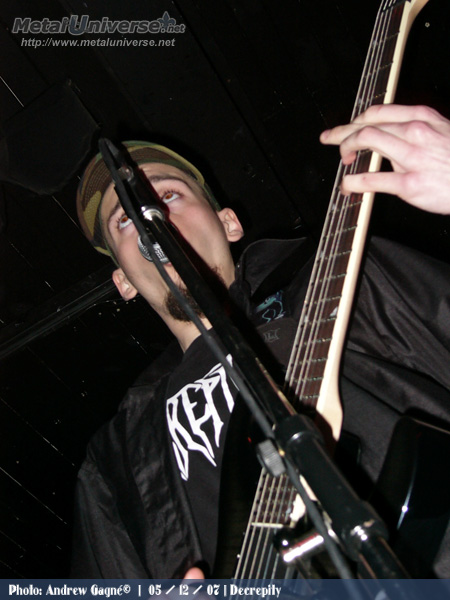 Le groupe suivant à prendre place sur les planches du Côté-Cour est Decrepity de Val-d’Or. Ça ne prend pas beaucoup de temps au groupe pour nous brutaliser la place avec force. Le public s’en donne à cœur joie dans le thrash et notamment dans un fameux thrash en rond très populaire en Abitibi, si bien demandé par le groupe. Le groupe est très intense sur scène d’où la facilité à faire embarquer son public. La voix de Martin Durette est vraiment impressionnante et très grasse, Pierre-Alexandre Mercier à la batterie est très fort sur les blast beats et le niveau des autres musiciens ne passe pas inaperçu. Decrepity nous jouent les pièces « The End Of Lying » et « Captured by Suffering » qui étaient disponibles sur leur promo 2005, en plus de nous jouer plusieurs chansons que nous retrouverons sur leur premier album également sur le label Cryogenic Records. De la musique de qualité, de la violence, une bonne présence de scène et un public conquis, voilà qui résume bien la performance de Decrepity. Un jeune groupe très prometteur!