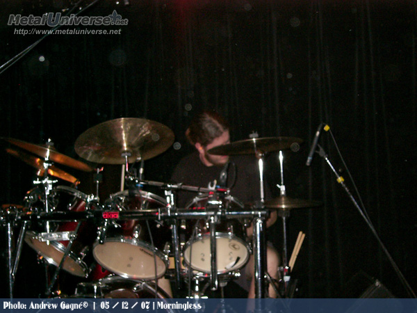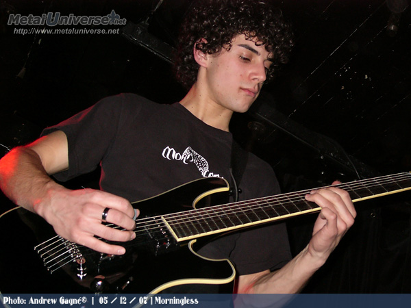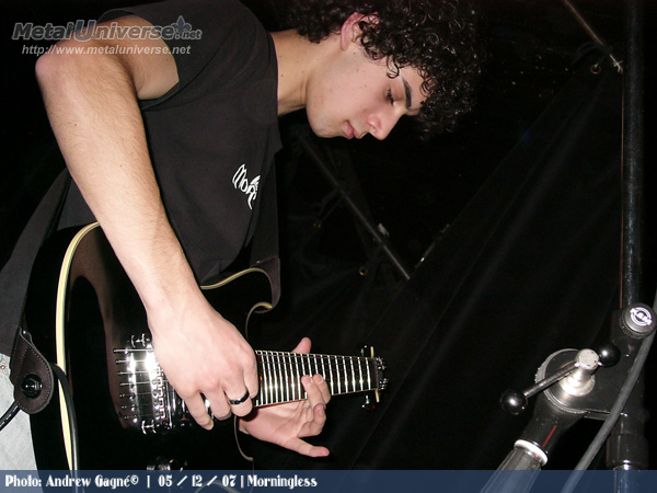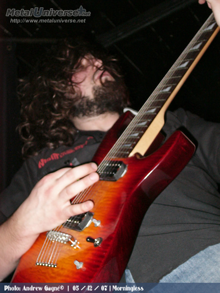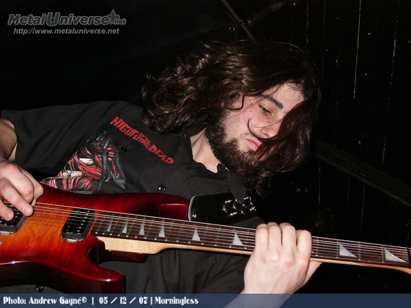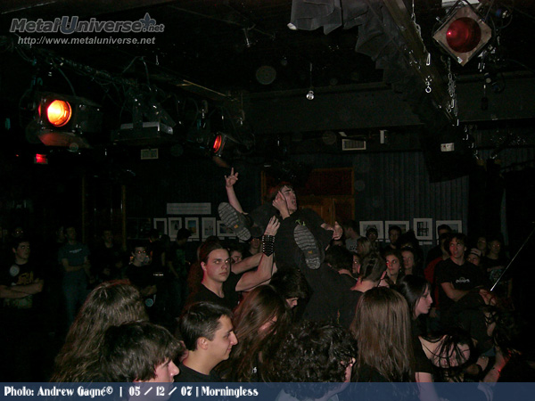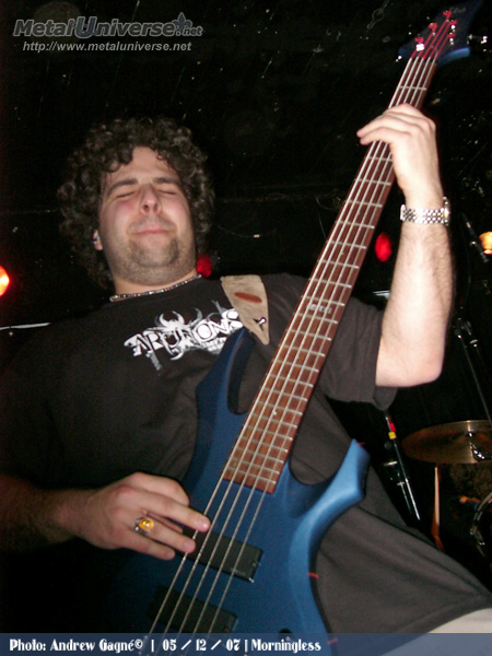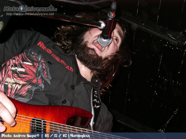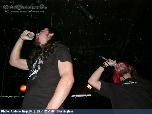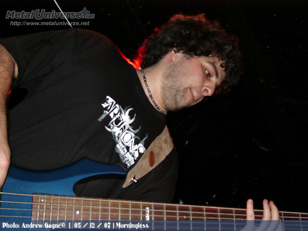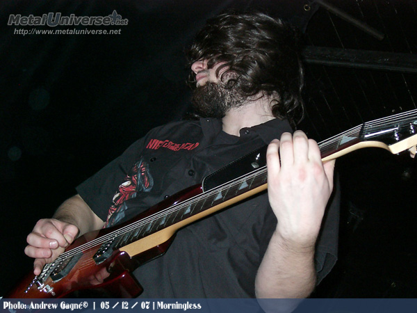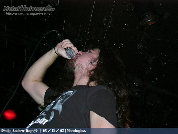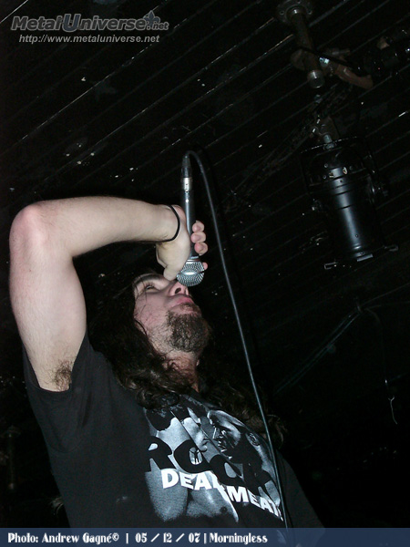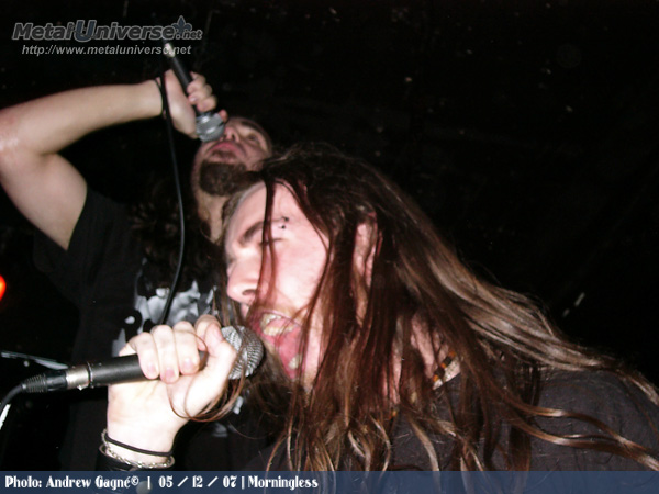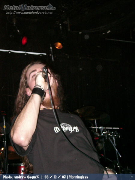Morningless prend finalement place sur scène en tant que tête d’affiche. Malheureusement pour eux, quelques personnes ont quitté avant leur prestation mais les gens présents ne laissent pas paraître ce détail en aucun temps. Nous avons droit à un bon nombre de pièces du démo « Assymetrical Fate » ainsi que de nouvelles pièces qui se retrouveront sur leur premier album. Le groupe nous interprète également leur cover réadapté de la chanson « Breaking The Law » de Judas Priest et un autre cover avec la pièce « Food For The Gods » d’In Flames pour le plus grand plaisir de certains amateurs présents. Pour la pièce « Dusk & Dawn », Morningless invitent leur ami Rémi Lavertu (ex-Shades of Tomorrow) à venir chanter en duo. Pour terminer la soirée, le public en redemandait encore mais le groupe avait pas mal épuisé leur répertoire alors pour contenter le public, ils refont la pièce « Inertia » une deuxième fois. Une solide performance!