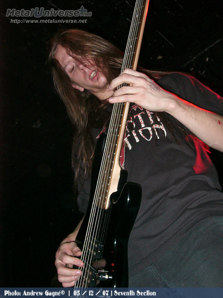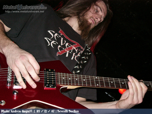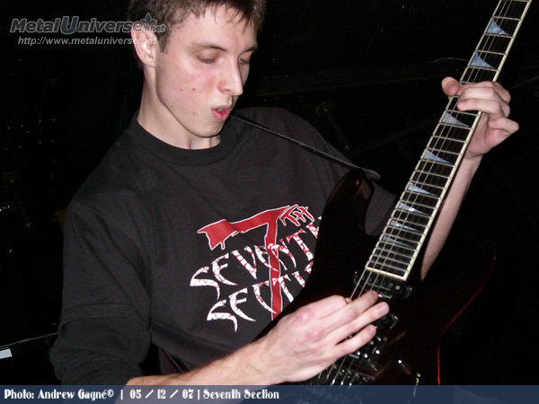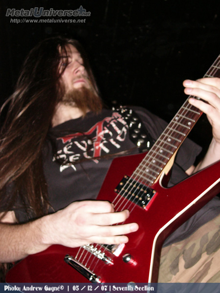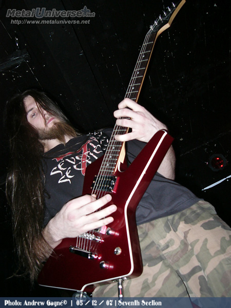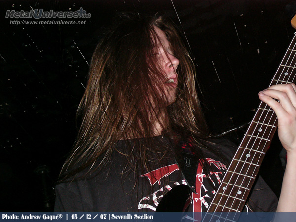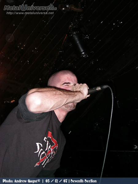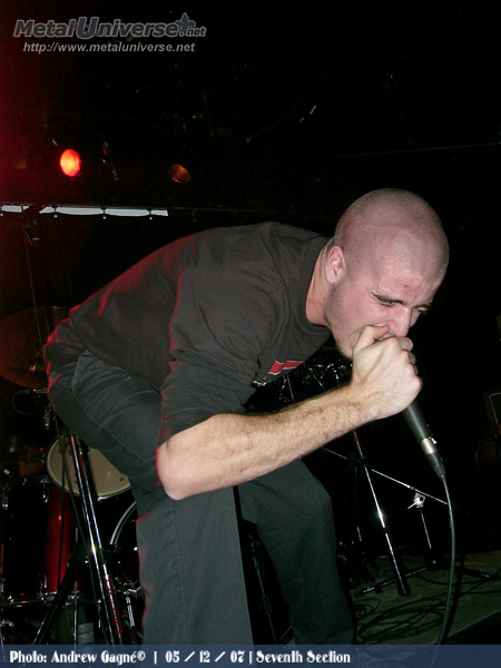 Nous sommes maintenant rendus au groupe saguenéen Seventh Section. Ce spectacle marque le retour de Nicolas Beaulieu, chanteur original du groupe. Le groupe est en forme et les gars réussissent à faire embarquer le public rapidement. Je ne cacherai pas le fait que j’ai toujours préféré Nathaniel Boivin au vocal mais avec la performance de ce soir, Nicolas Beaulieu n’a rien à lui envier et je trouve qu’il s’est grandement amélioré au niveau de sa présence de scène comparé aux dernières fois que je l’ai vu, un gros plus pour le groupe. L’exécution de chacune des pièces se fait avec la précision d’un chirurgien. L’intensité du groupe est surprenante, enchaînant leurs pièces rapidement sans même nous laisser reprendre notre souffle. Au cours de l’année, nous aurons droit au premier démo du groupe et en attendant, vous pouvez toujours aller écouter les chansons « About Progress » et « The Utopian » disponibles sur leur MySpace (www.myspace.com/seventhsection). Une performance très appréciée du public.