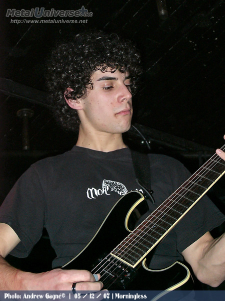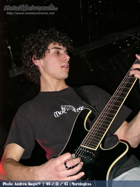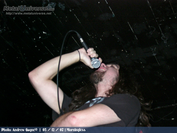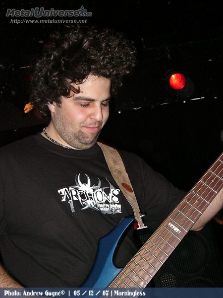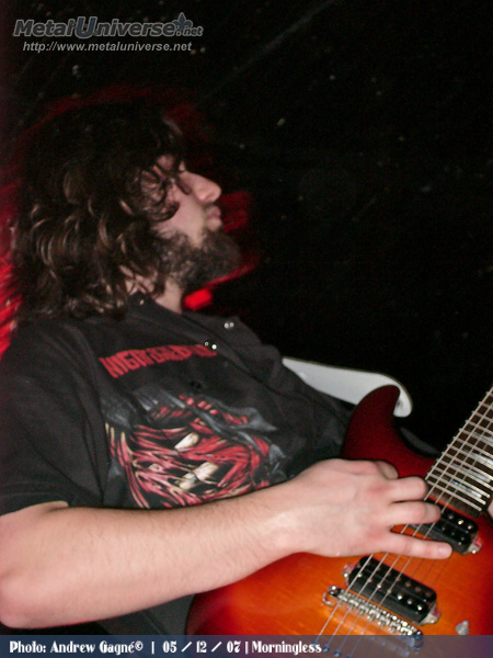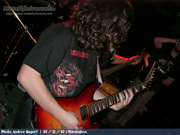 Morningless prend finalement place sur scène en tant que tête d’affiche. Malheureusement pour eux, quelques personnes ont quitté avant leur prestation mais les gens présents ne laissent pas paraître ce détail en aucun temps. Nous avons droit à un bon nombre de pièces du démo « Assymetrical Fate » ainsi que de nouvelles pièces qui se retrouveront sur leur premier album. Le groupe nous interprète également leur cover réadapté de la chanson « Breaking The Law » de Judas Priest et un autre cover avec la pièce « Food For The Gods » d’In Flames pour le plus grand plaisir de certains amateurs présents. Pour la pièce « Dusk & Dawn », Morningless invitent leur ami Rémi Lavertu (ex-Shades of Tomorrow) à venir chanter en duo. Pour terminer la soirée, le public en redemandait encore mais le groupe avait pas mal épuisé leur répertoire alors pour contenter le public, ils refont la pièce « Inertia » une deuxième fois. Une solide performance!