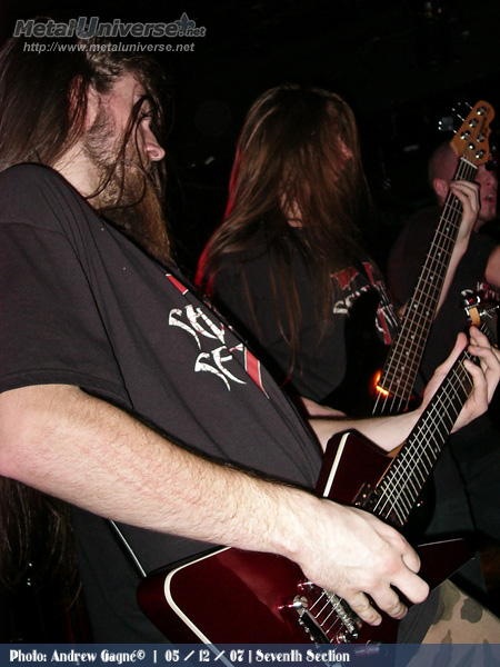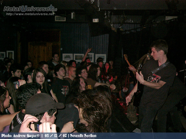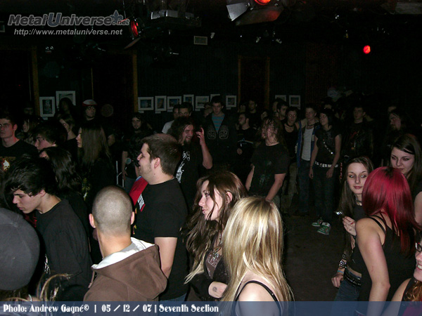Nous sommes maintenant rendus au groupe saguenéen Seventh Section. Ce spectacle marque le retour de Nicolas Beaulieu, chanteur original du groupe. Le groupe est en forme et les gars réussissent à faire embarquer le public rapidement. Je ne cacherai pas le fait que j’ai toujours préféré Nathaniel Boivin au vocal mais avec la performance de ce soir, Nicolas Beaulieu n’a rien à lui envier et je trouve qu’il s’est grandement amélioré au niveau de sa présence de scène comparé aux dernières fois que je l’ai vu, un gros plus pour le groupe. L’exécution de chacune des pièces se fait avec la précision d’un chirurgien. L’intensité du groupe est surprenante, enchaînant leurs pièces rapidement sans même nous laisser reprendre notre souffle. Au cours de l’année, nous aurons droit au premier démo du groupe et en attendant, vous pouvez toujours aller écouter les chansons « About Progress » et « The Utopian » disponibles sur leur MySpace (www.myspace.com/seventhsection). Une performance très appréciée du public.