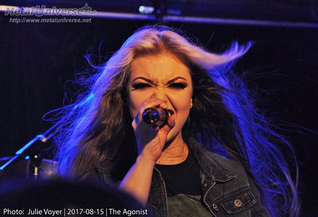 Vers 22h15, The Agonist est monté sur scène pour compléter le crescendo d’énergie de la soirée. C’est avec la chanson My Witness, Your Victim qu’ils ont débuté leur prestation, et ce, au grand plaisir de la foule. À quelques occasions, Vicky Psarakis (chanteuse) s’est adressée à la foule, principalement en anglais en mentionnant au passage qu’elle ne parle très peu français. Bien que la popularité de The Agonist soit en constante évolution à l’étranger, le groupe originaire de Montréal est régulièrement en spectacle à Québec au grand plaisir de ses fans. Évidemment, mosh pits et circle pits étaient de mise. Par contre, le spectacle a été ponctué de temps morts et d’intermèdes, ce qui fait perdre le rythme malgré l’énergie débordante de Danny Marino (guitare), Chris Kells (basse) et de Pascal « Paco » Jobin (guitare) qui, à quelques reprises, a mentionné, sourire aux lèvres, que le public était malade. Malheureusement, la prestation enflammée de The Agonist, qui a puisé tant dans leur nouvel album, Five sorti en 2016, que dans leur plus vieux matériel, s’est terminée trop rapidement, après environ 1h15.