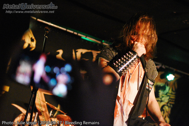 Tout d’abord, c’est le groupe old school death/brutal death metal Bleeding Remains qui est monté sur scène les premiers. Créé en avril 2018 à Lévis, il prépare actuellement la sortie de son premier nommé « Inherit The Horror », qui sera mis en vente plus tard via CDN Records. Bref, il s’agissait du moment idéal pour présenter aux gens sur place les titres qui se trouveront sur ce premier opus. Leur musique est lourde et violente. Alors, on peut oublier les balades ! Sur scène, les membres font du bon travail et le chanteur, JP, en a profité à quelques reprises pour aller rejoindre le moshpit. Leur performance illustre bien à quoi allait ressembler le reste de la soirée, on ne va pas s’ennuyer.