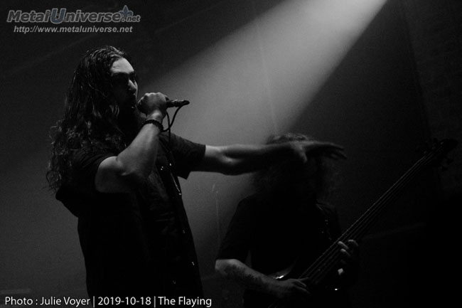 Dès 18h30, la scène se fait assaillir par ce que je considère comme l’un des meilleurs groupes actuels issus de la ville de Québec : The Flaying. Pendant une bonne demie heure, ils nous ont servi leur death metal original à saveur tantôt technique et tantôt plutôt brutale sans se soucier du fait qu’ils jouaient devant une salle presque vide. C’est toujours difficile côté réponse du public lorsqu’un show commence aussi tôt. C’est tout de même en toute humilité que le groupe a continué à livrer la marchandise. La deuxième moitié de leur set était partagée avec un cinquième membre. Vanessa Martel (Within Embers) s’est joint au groupe pour effectuer quelques back vocals. Bien que l’addition soit charmante et judicieuse au niveau des timbres, la mise en scène visiblement un peu dernière minute laissait un léger froid planer parmi la foule.