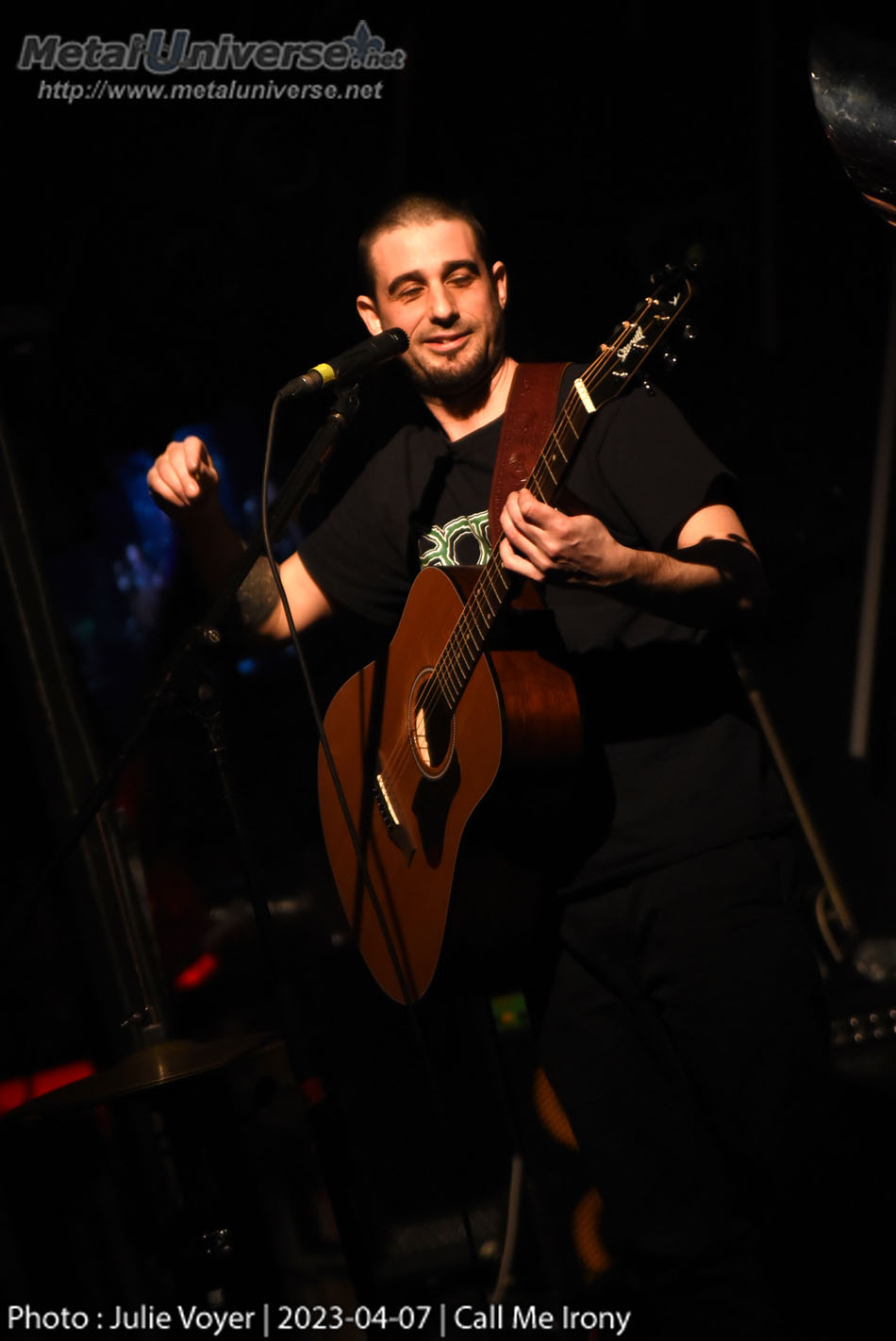 C’est CALL ME IRONY qui commence la soirée en formule duo, leur batteur s’étant « cassé les reins » et leur bassiste ayant plié bagage. C’est donc avec générosité que les hyper sympathiques Geneviève et Kevin ont quand même donné leur show, en version acoustique avec guitare et mélodica occasionnel. En plus de compos humoristiques et sérieuses qui se trouveront sur un prochain EP en chantier, le groupe a interprété quelques reprises à sa façon, avec la participation d’un public déjà prêt pour la suite. Et pour ma part, je suis prête à entendre la version quatuor.