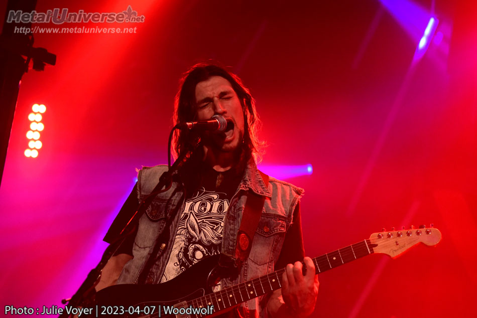C’est WOODWOLF qui termine la soirée. Ceux qui connaissent la formation ou qui lisent régulièrement les critiques sur MetalUniverse savent que je ne dis que du bon sur eux, alors je ne me répéterai pas. Leur prestation est sincère sans être parfaite, et c’est ce qui est plaisant – ils nous font ressentir un trip comme si on était avec eux dans notre sous-sol. Fascinants à écouter et surtout à regarder, Fred et Alex, jumeaux cosmiques, jouent en symbiose, en se jetant des coups d’œil, ils semblent se répondre d’instinct. Les images de fractales en fond de scène rajoutent à l’aspect psychédélique de la prestation, qui doit être vécue intensément.