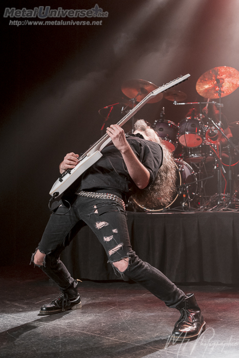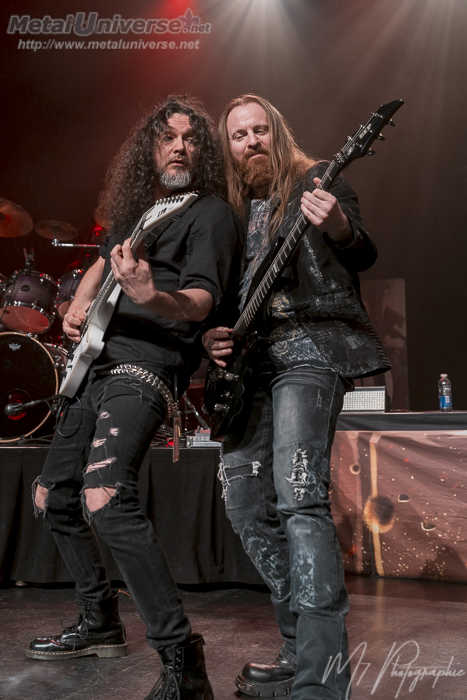 C’est la formation Xandria qui est chargée de réchauffer la foule, quoique celle-ci est déjà bien prête à festoyer. Ne comptant qu’un seul membre de sa formation originale, soit Marco Heubaum, Xandria peine à se trouver une réelle identité depuis le départ fracassant de Dianne Van Giersbergen en 2017. C’est d’ailleurs tout à fait palpable sur la scène, alors qu’on s’aperçoit rapidement que les membres du groupe manquent de complicité. Il est évident que lorsqu’on a une sixième chanteuse en un peu plus de 20 ans de carrière, un cinquième bassiste et un cinquième guitariste, on ne s’attend pas à une parfaite harmonie… Toujours est-il que la nouvelle chanteuse, Ambre Vourvahis, est une belle acquisition pour la troupe d’origine allemande, elle qui présente un certain charisme et une présence de scène qui se démarque. Elle s’adresse à la foule dans un Français impeccable tout au long de la prestation, ce qui est toujours fort apprécié des amateurs québécois. Fait particulier : durant toute la prestation de Xandria, les lumières au plafond du Théâtre Capitole demeurent allumées, ce qui ne contribue pas à créer une ambiance optimale… Dommage! C’est à travers 8 chansons, majoritairement tirées du plus récent opus The Wonders Still Awaiting, que Xandria tentera de conquérir (ou de reconquérir) le cœur des fans sur place. Un nouveau morceau tiré du prochain album est aussi proposé par le groupe et comporte étonnamment quelques moments de growl, ce qui est tout de même assez bien, mais qui éloigne tout de même encore plus Xandria de ses racines mélodiques et opératiques qui caractérisait si bien la formation au tournant des années 2010. La dernière pièce, Nightfall, est un retour aux sources bienvenu et célébré par les spectateurs. Performance correcte, donc, mais qui est tout même chaleureusement accueillie par les amateurs, maintenant prêts à lever le poing bien haut dans les airs pour les têtes d’affiche tant attendues!