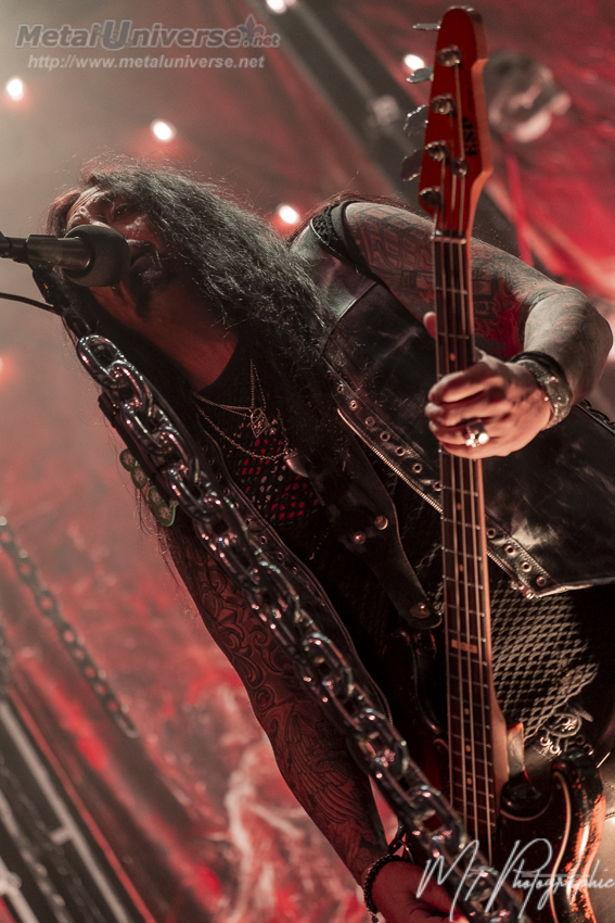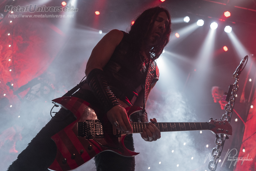 Une pause d’environ 30 minutes a lieu pour finaliser le stage de WASP et disons que juste pour le micro de Blackie Lawless, ça semble prendre une certaine expertise pour qu’il soit assemblé correctement. Il y a en effet un énorme pied de micro central avec une espèce de grosse colonne vertébrale couronnée d’une tête de mort et de bras métalliques avec des chaînes, c’est plutôt bad ass. Le groupe joue l’intégralité du premier album pour cette tournée. C’est I Wanna Be Somebody débute sur l’album et elle fracasse le silence. Inutile de vous dire que tout le monde embarque directement dans l’ambiance de Glam Metal/Rock qui nous est servi. Blackie semble en bonne voix, toutefois il nous laisse le soin de chanter le refrain avec ses guitaristes et les back tracks qui propulsent l’anthem vocal au niveau de la version studio. Je savais qu’il y en aurait des trames sonores de fond, mais au moins, quand il chante, on entend sa voix perchée légèrement au-dessus. Dans les couplets, c’est davantage sa voix qui ressort et les back tracks sont plus faibles ou absents. Ils chantent pas tout exactement comme sur l’album non plus, alors ça me rassure qu’il chante vraiment. À 68 ans, je considère que sa voix est encore très appréciable, alors il peut bien se reposer dans les refrains surtout que la plupart sont des singalong chantés par tous à l’unisson.