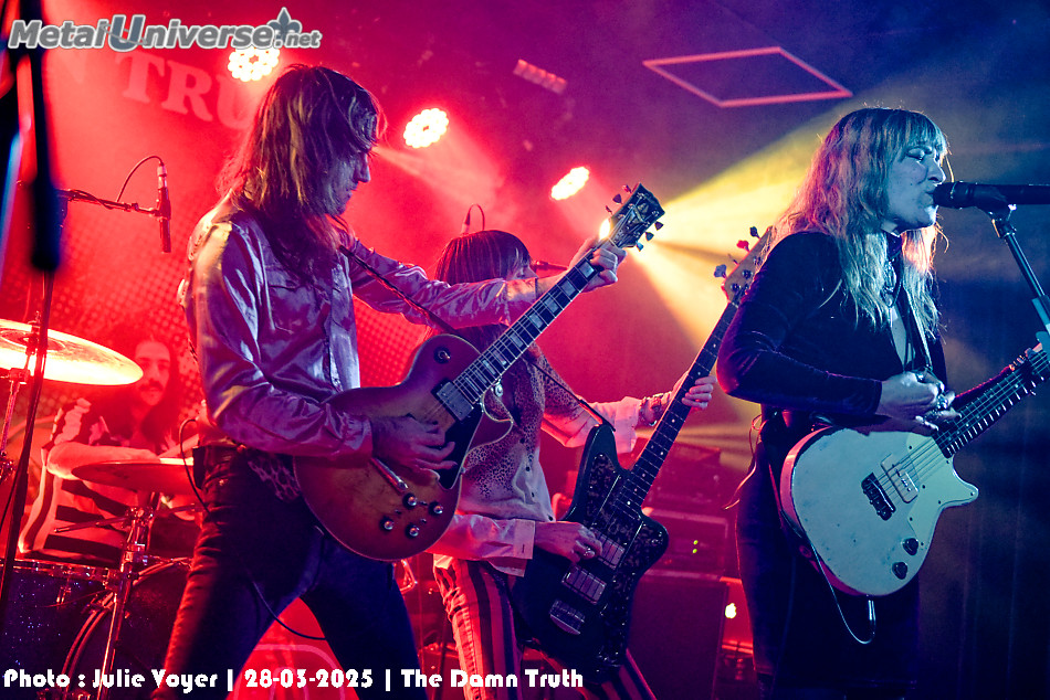 Après le « change up », le quatuor de The Damn Truth s’est fait désirer. Je connaissais de nom, on m’avait dit que c’était à voir… que oui! Sur l’intro de « White Rabbit » de Jefferson Airplane, ils arrivent sur une scène dépouillée, avec un look tout à fait années 1970, leur toile est déjà tendue en fond de scène, l’ambiance est créée. Ils ont commencé en force avec notamment « This Is Who We Are Now » et « Be Somebody », celle-ci étant la première pièce de leur album éponyme tout nouveau tout beau, sorti il y a deux semaines. Toute la soirée l’interaction avec la foule était juste parfaite, la chanteuse Lee-la nous invitant à accompagner sa belle voix rauque et à taper des mains, et Tom le guitariste et PY le bassiste s’échangeant leur place et s’avançant pour leurs solos. Le son était parfait aussi, et l’éclairage était maîtrisé comme je le vois rarement. Le groupe est généreux en temps et en chansons : 16 chansons en tout, avec des solos pleins de passion et des pauses feeling pendant les ballades. Avec eux, on n’a pas le choix d’être « dedans », c’est du rock’n’roll brut et authentique comme on l’aime.
