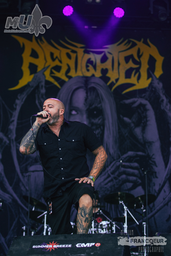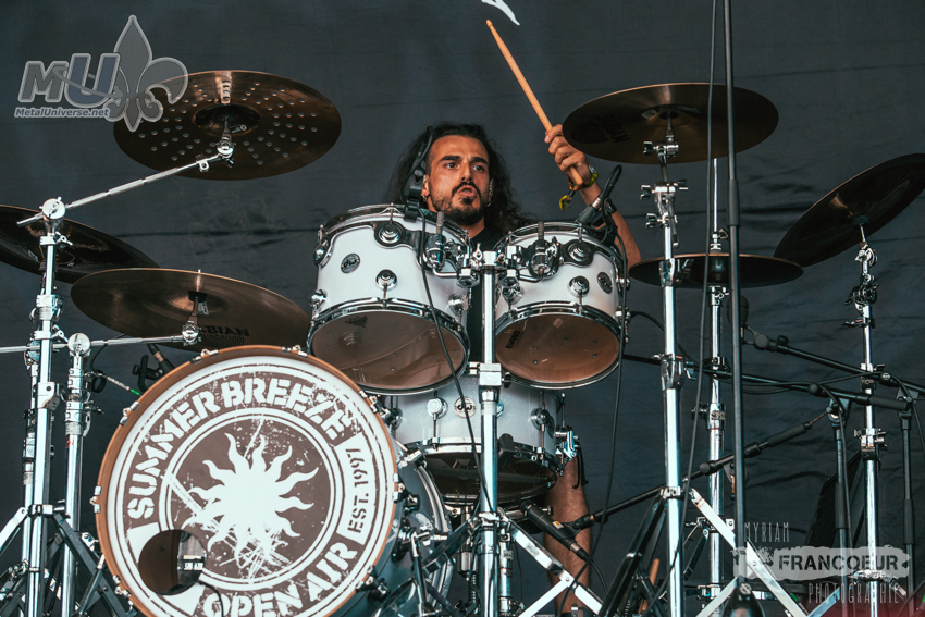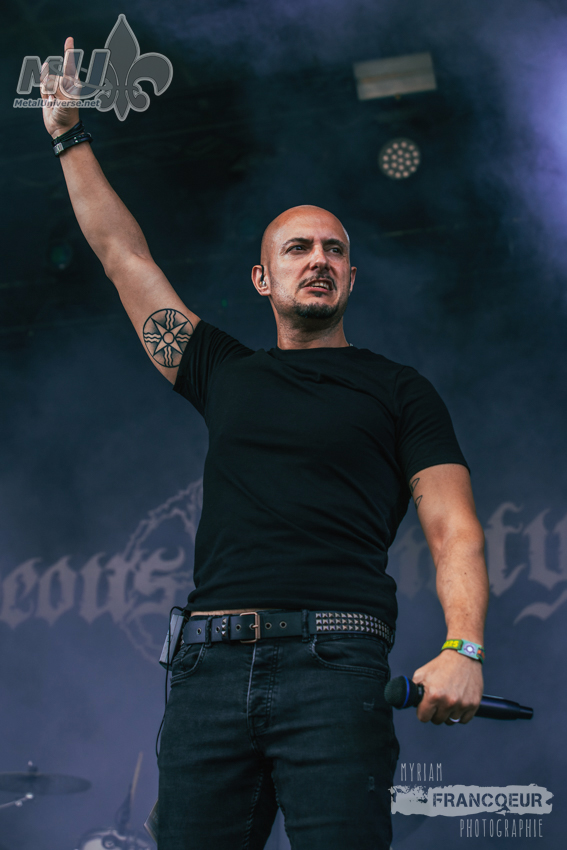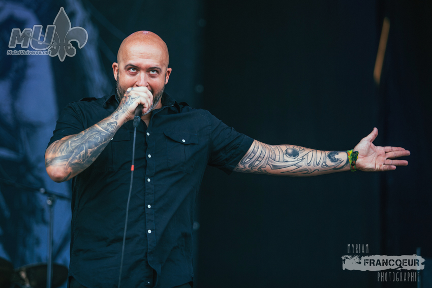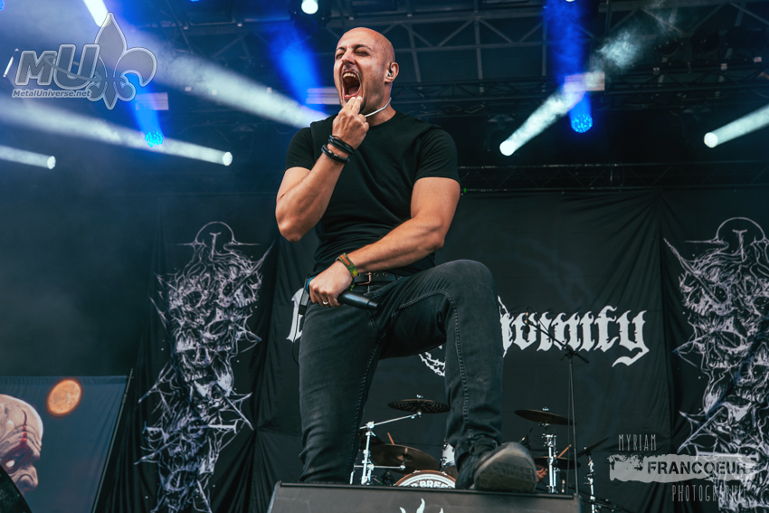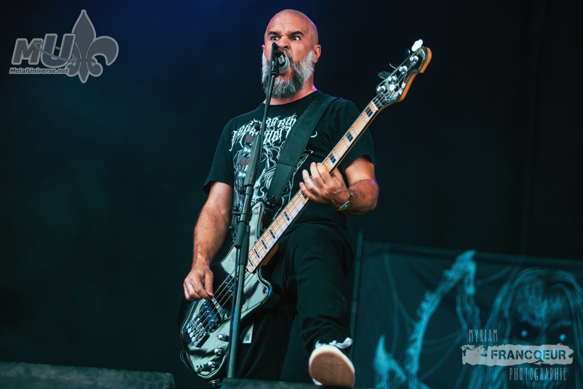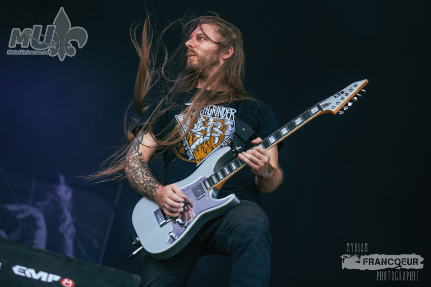 Benighted, écrivais-je donc! Les Stéphanois, en tournée estivale, ont servi leur macabre deathdring avec leur habituelle vigueur. La foule a eu besoin d’être arrosée parce que le mercure grimpait rapidement sous le soleil! Évidemment, quand le métalleux moyen est habillé de noir, c’est pas surprenant qu’il a besoin de plus de rafraîchissement.