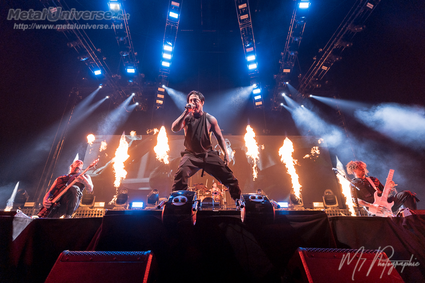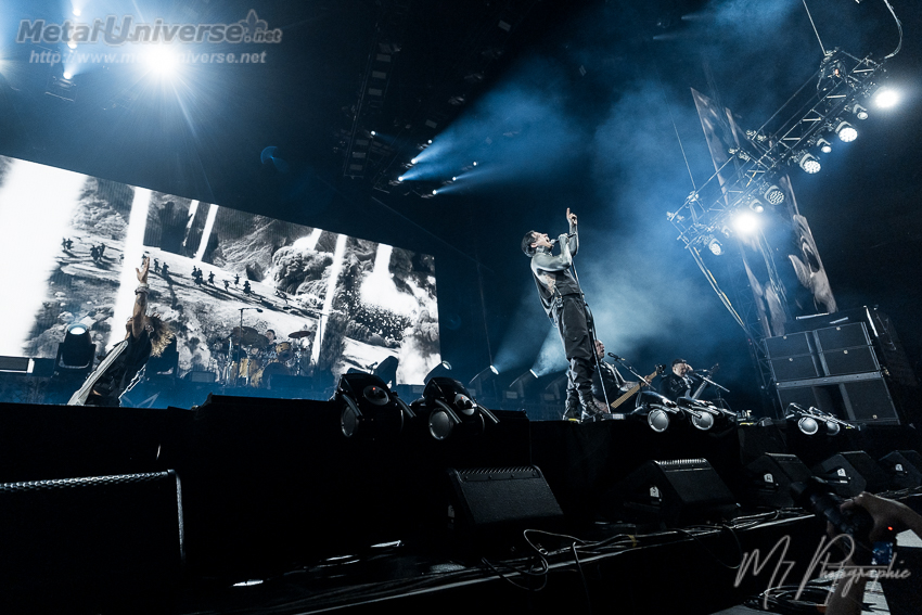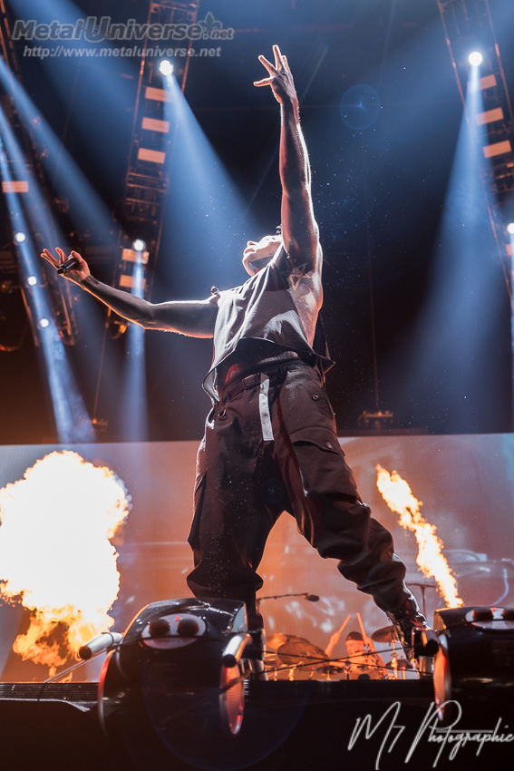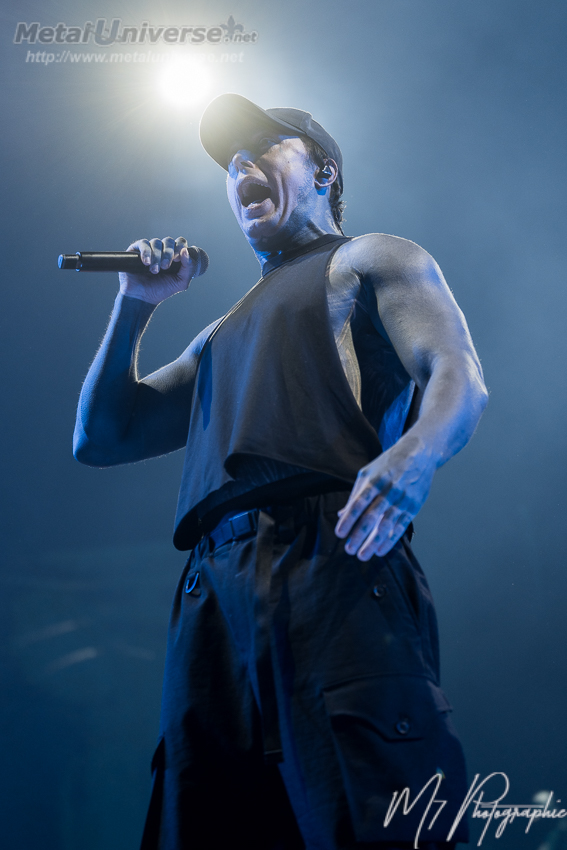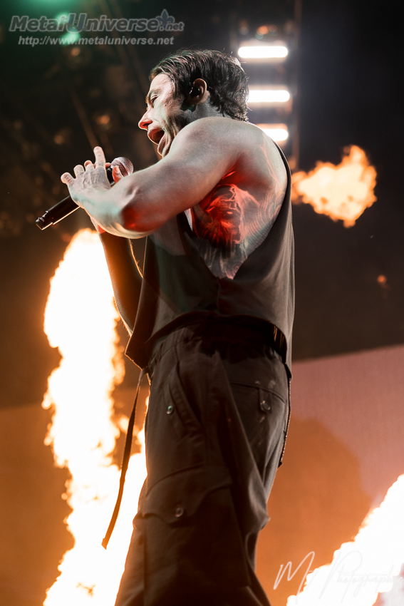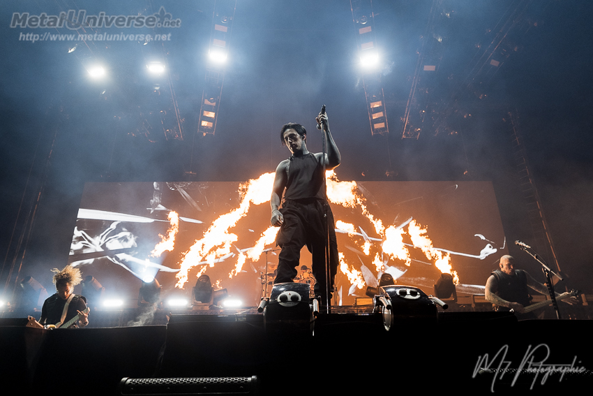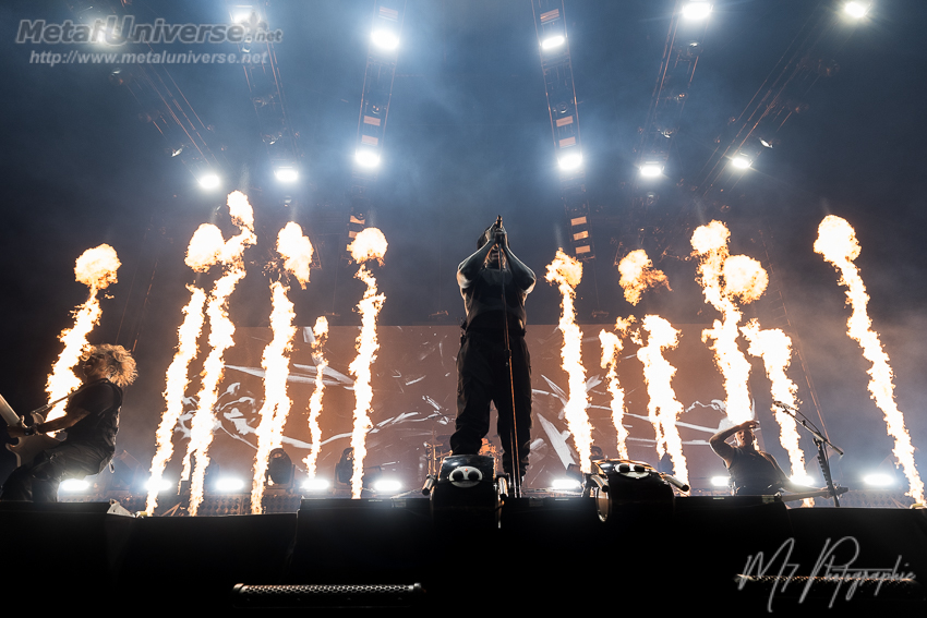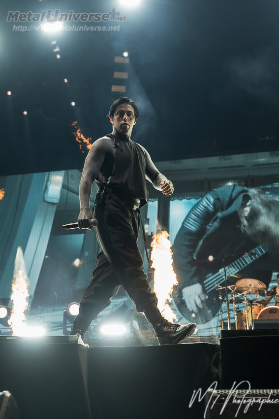 Personnellement, j’attendais leur retour à Montréal depuis 2019, année de la sortie de Popular Monster, une chanson que je ne me lasse jamais d’écouter (et de hurler à tue-tête). L’entrée de Radke sur Prequel était stoïque et puissante, soutenue par un écran géant projetant leurs vidéoclips en arrière-plan. Ce contraste entre l’image et la performance live donnait une profondeur unique au spectacle. Mention spéciale à God Is A Weapon, où les visuels sombres et terrifiants avec Marilyn Manson ajoutaient une dimension cinématographique, presque oppressante. Ajoutez à ça des effets de flammes qui nous chauffaient autant que l’ambiance électrisante elle-même — l’immersion était totale.