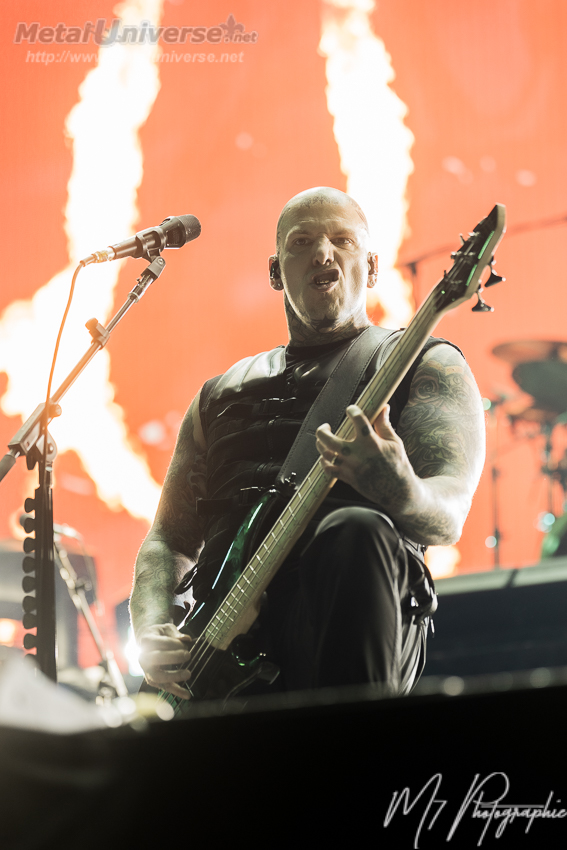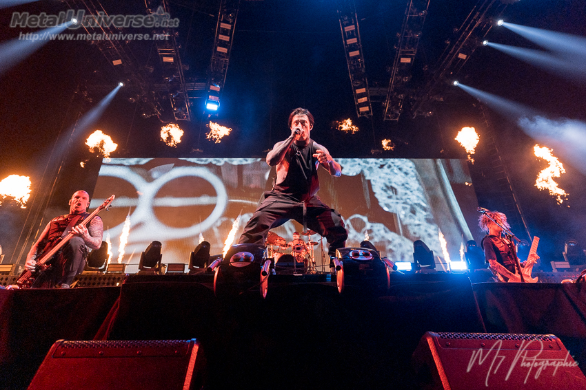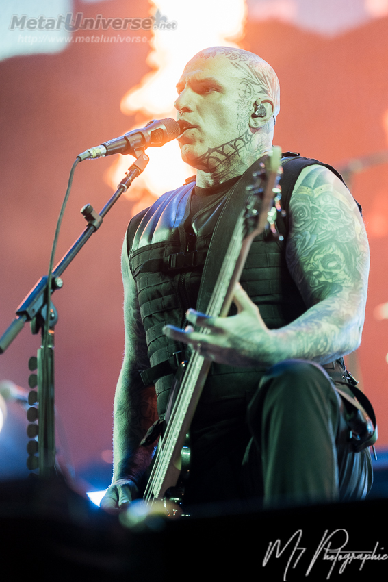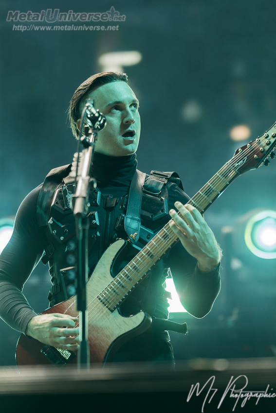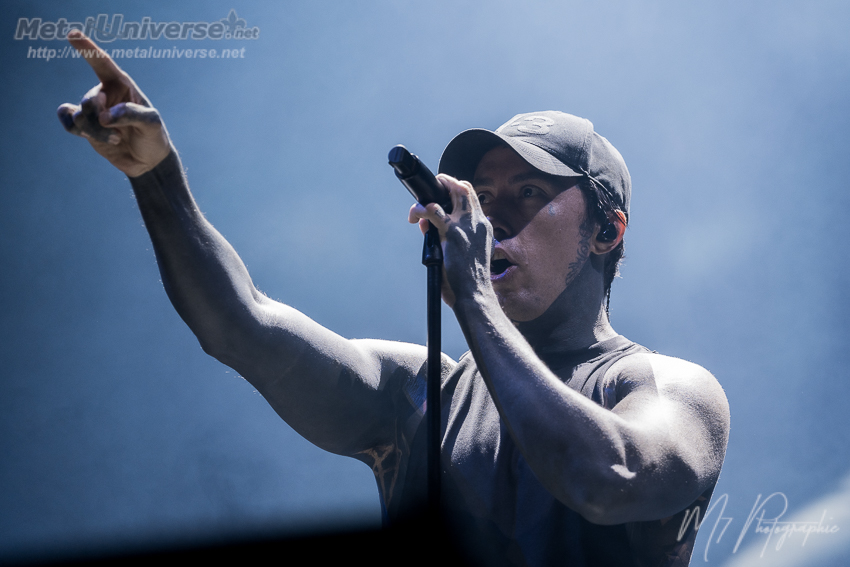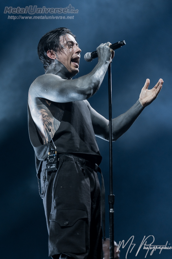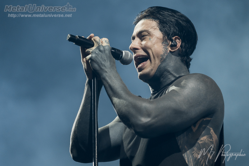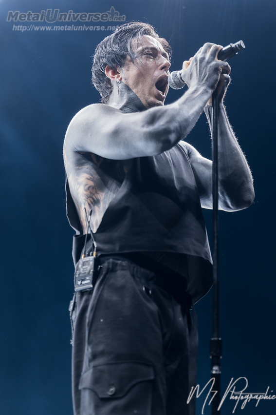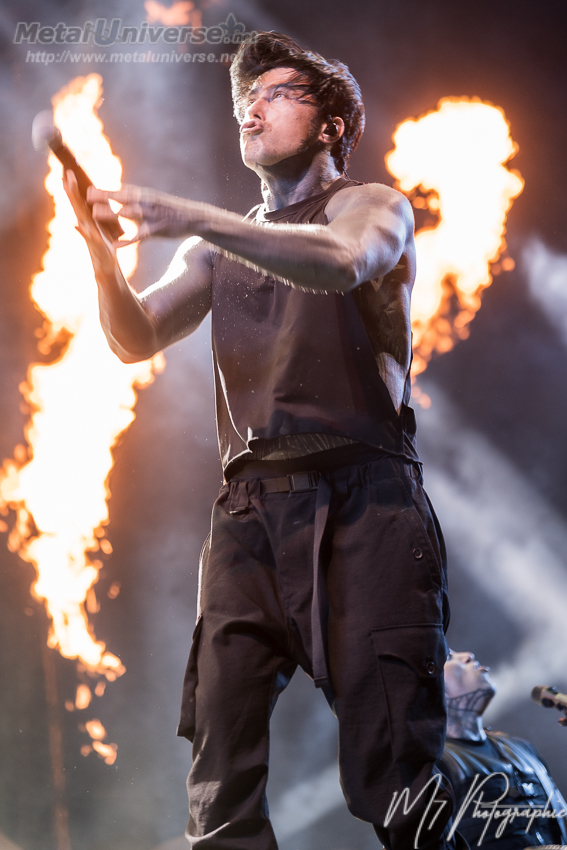 Personnellement, j’attendais leur retour à Montréal depuis 2019, année de la sortie de Popular Monster, une chanson que je ne me lasse jamais d’écouter (et de hurler à tue-tête). L’entrée de Radke sur Prequel était stoïque et puissante, soutenue par un écran géant projetant leurs vidéoclips en arrière-plan. Ce contraste entre l’image et la performance live donnait une profondeur unique au spectacle. Mention spéciale à God Is A Weapon, où les visuels sombres et terrifiants avec Marilyn Manson ajoutaient une dimension cinématographique, presque oppressante. Ajoutez à ça des effets de flammes qui nous chauffaient autant que l’ambiance électrisante elle-même — l’immersion était totale.