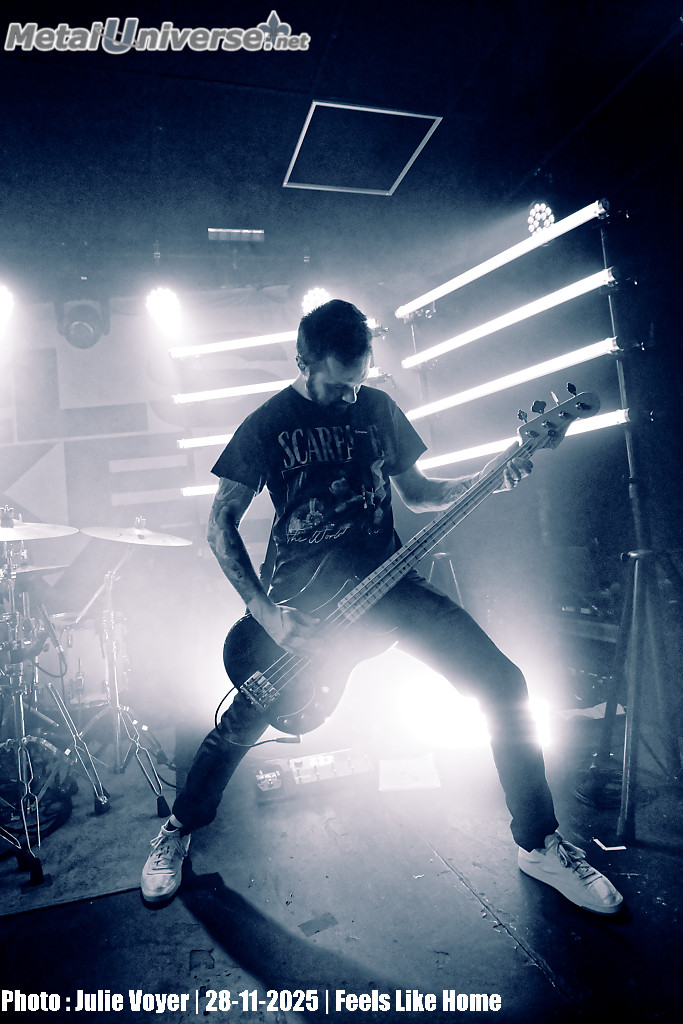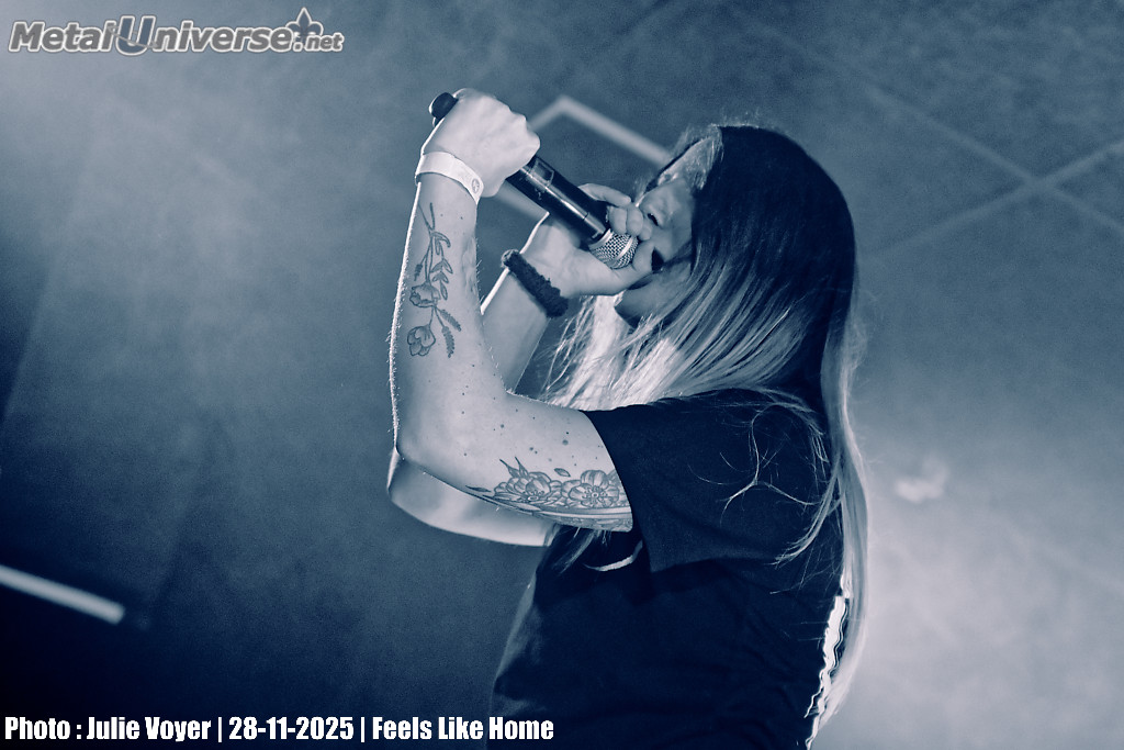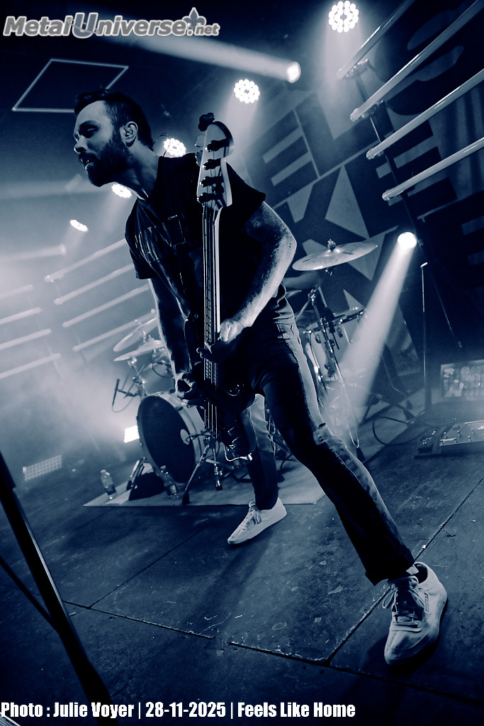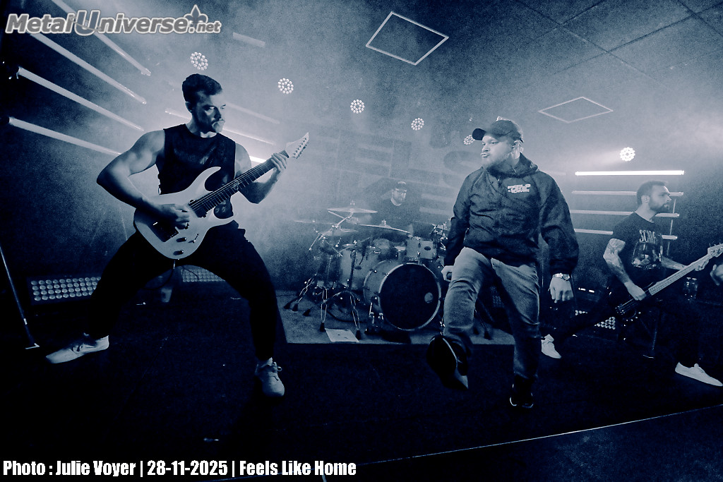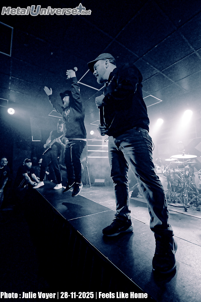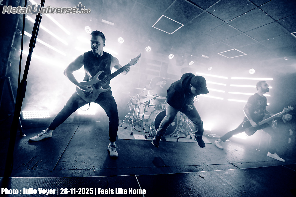 Enfin, les vedettes de la soirée, Feels Like Home, embarquent sur scène avec un décor lumineux digne d’un vidéoclip. C’est là que tous les fans s’avancent pour ne pas être exclus de l’action dès le départ en force avec “Bound For Hell”. On a droit à toute une variété de chansons, allant de classiques d’il y a 10 ans comme “Burning Pages”, “Gamebreaker” et