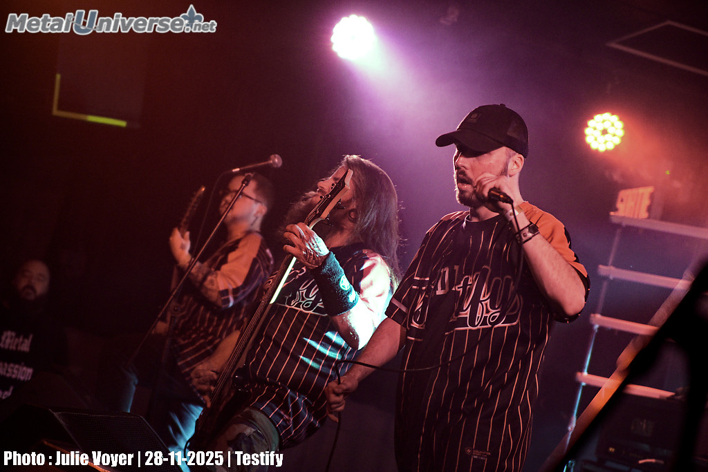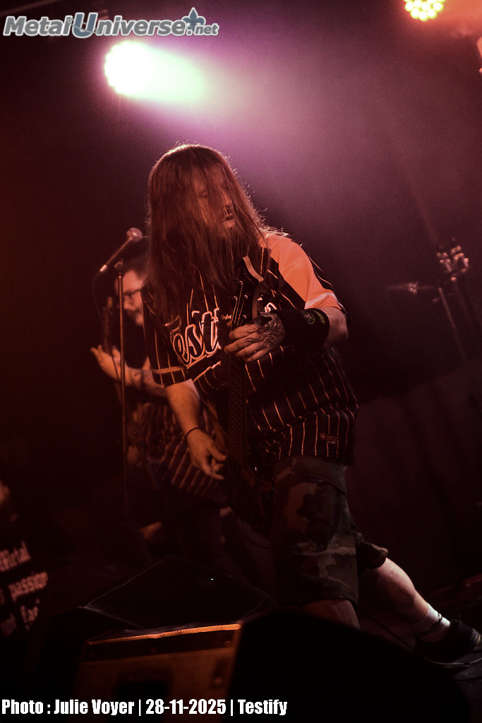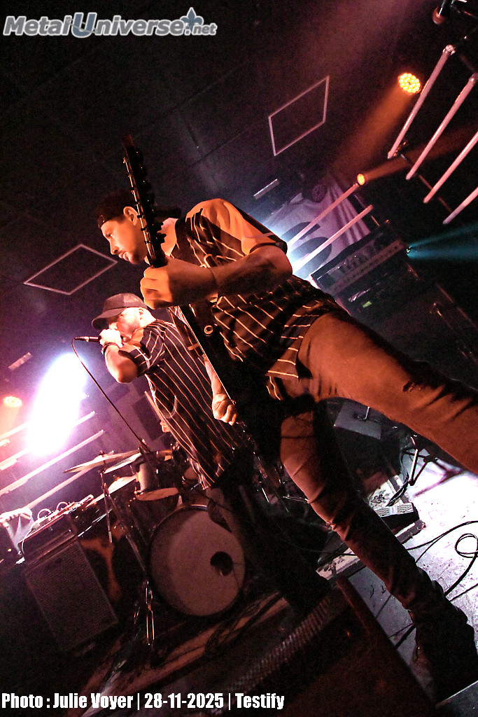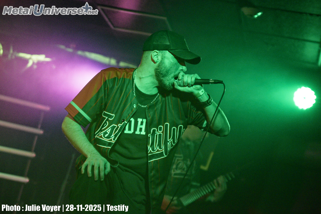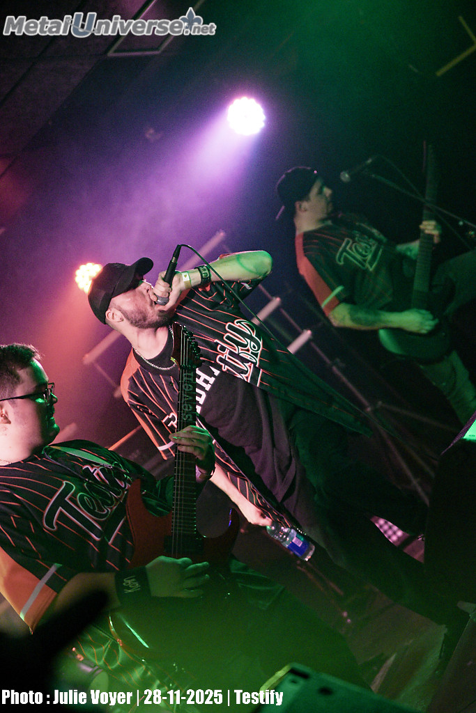 Les suivants sont Testify, qui se font déjà remarquer au soundcheck par leur habits de baseball. Bien que la première soirée se voulait plus hardcore et la seconde plus metal, Testify ne se gêne pas avec leur coté un peu death et surtout, nous offre des pig squeals ravissants. Le problème technique mineur ne les arrête pas et ils font bouger toute la salle. Enfin, pour la dernière chanson, on assiste à un remaniement ministériel : le batteur va chanter, un guitariste prend sa place à la batterie, et ils nous rejoignent dans le pit pour brasser tout le monde.