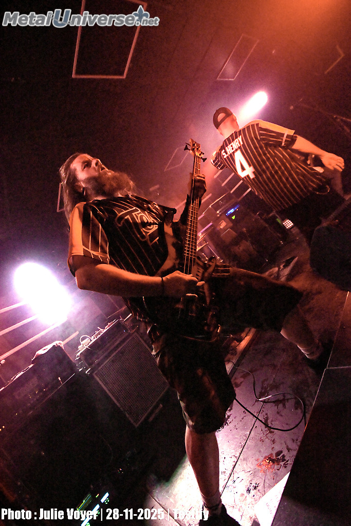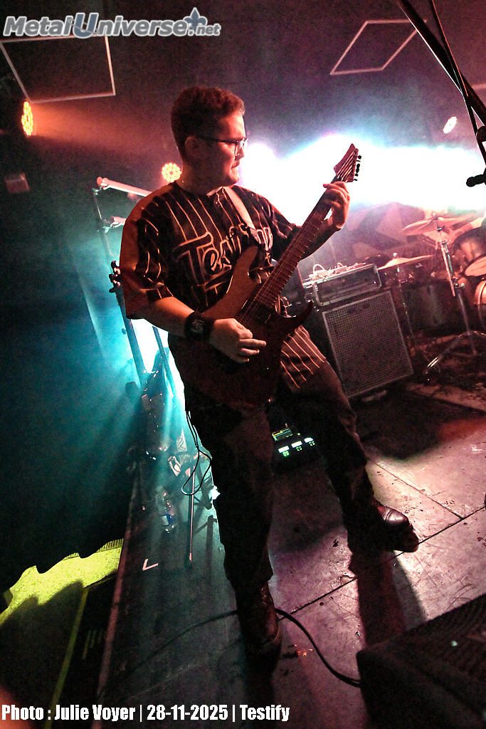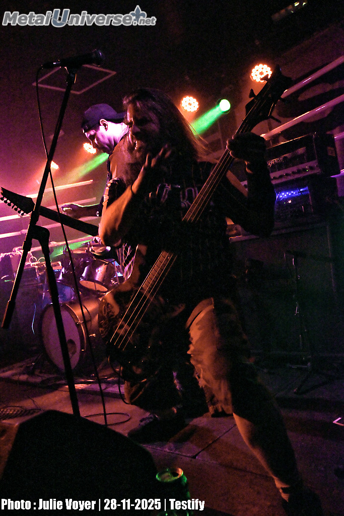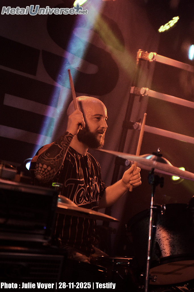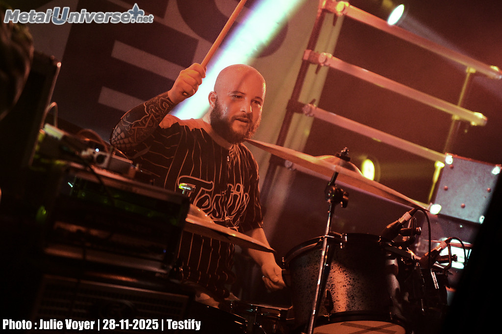 Les suivants sont Testify, qui se font déjà remarquer au soundcheck par leur habits de baseball. Bien que la première soirée se voulait plus hardcore et la seconde plus metal, Testify ne se gêne pas avec leur coté un peu death et surtout, nous offre des pig squeals ravissants. Le problème technique mineur ne les arrête pas et ils font bouger toute la salle. Enfin, pour la dernière chanson, on assiste à un remaniement ministériel : le batteur va chanter, un guitariste prend sa place à la batterie, et ils nous rejoignent dans le pit pour brasser tout le monde.