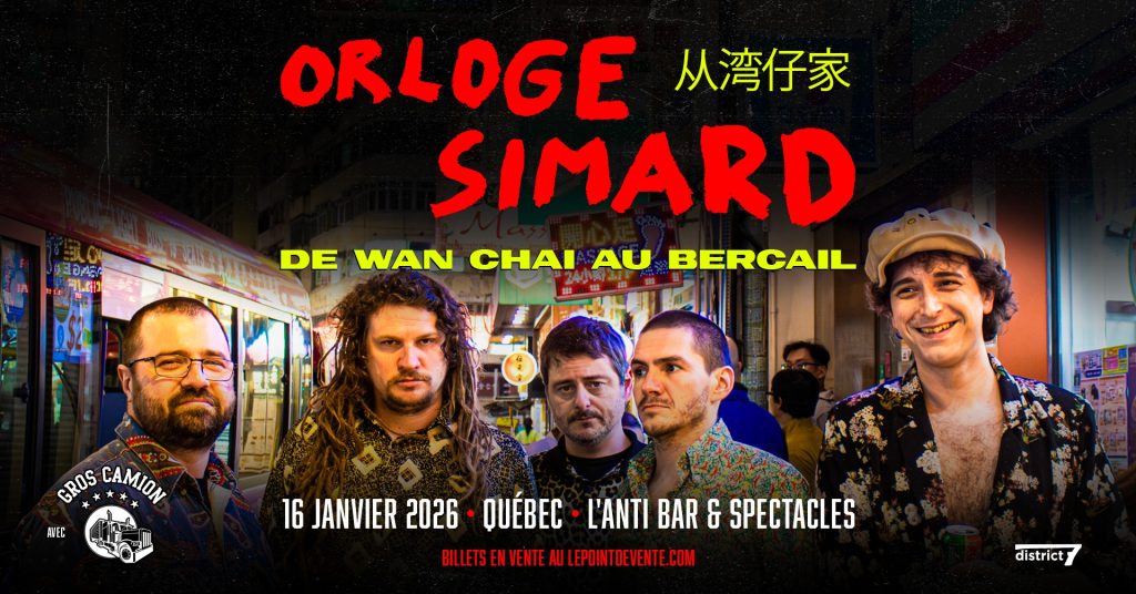 Le fait que Gros Camion soit en première partie me rappelle justement mon dernier spectacle d’Orloge Simard, qui avait eu lieu à l’Agora. C’était une soirée mémorable, même mon chandail est demeuré taché de vin !