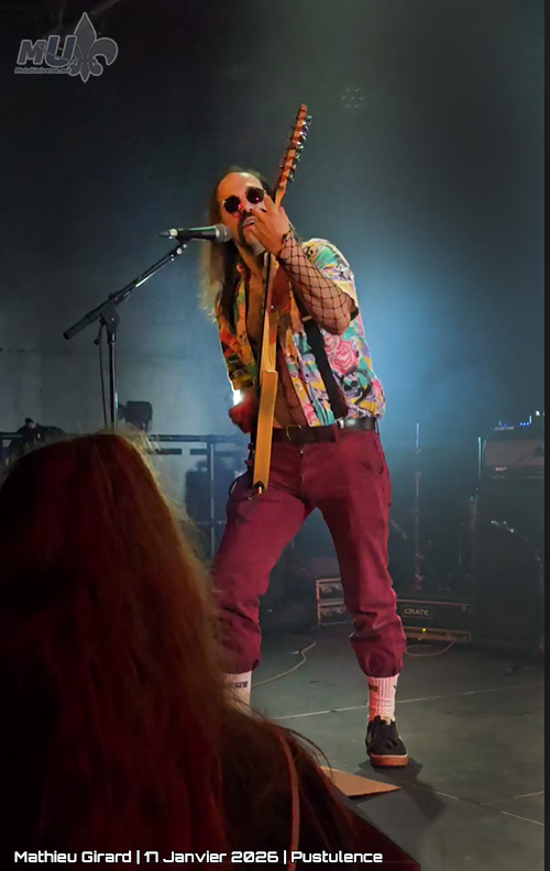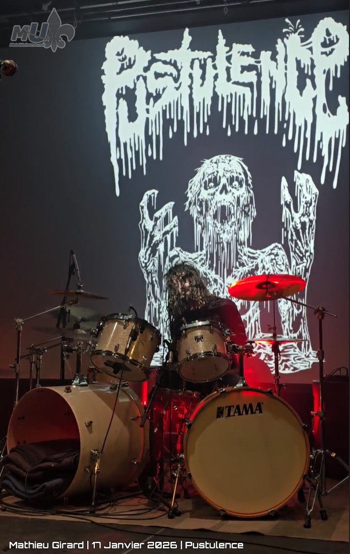La soirée commence de façon brutale, vite, forte et violente avec Pustulence. Les 3 membres sont tellement différents, on dirait un hommage à une célèbre série de science-fiction comportant 2 mondes : Simon Tremblay (voix/basse) : coupe clean, en noir, stretchs dans les oreilles ; Guillaume Corneau (chant/guitare) sort d’un voyage difficile dans les années 80, chemise fleurie, bretelles, fu manchu légendaire, lunettes de soleil et… body fishnet (oui oui, complet) ; et Alexandre Proulx, le mind flayer aux drums, en arrière-plan, inquiétant mais dominant.