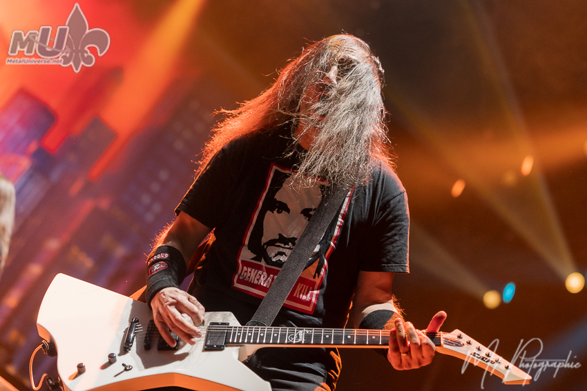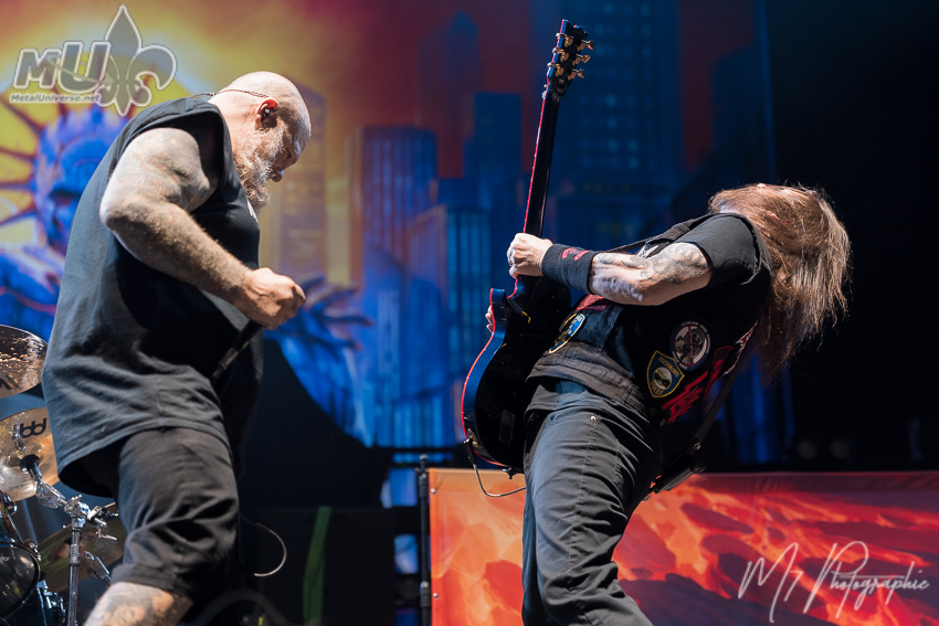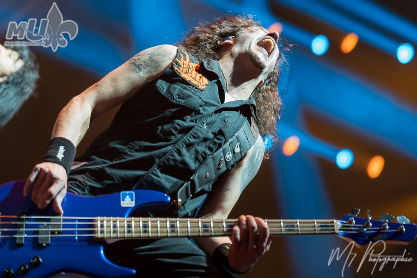 What can be said about Anthrax? I had the chance to see them for two performances during 70 000 Tons of Metal barely a month and a half ago. What was the difference? During the cruise, the members were rested, having a good time and despite the cold the energy was even higher, the batteries were at one hundred percent. In Québec City, it was the end of a tour, and you could feel it. Is that negative? Not at all. Two different situations that still allowed us to enjoy their talent and energy, because yes, there was still plenty of it. Joey Belladonna looked a bit more tired than on the cruise, but still just as excellent. Surrounded by Scott Ian, Jonathan Donais, Frank Bello, and Charlie Benante, Anthrax is rarely disappointing. A great thrash metal evening the way they know how to deliver. Anthrax clearly has a deep love for Iron Maiden, especially with the introduction of their show starting with The Number of the Beast. That respect goes way back. Guitarist Scott Ian has previously explained in interviews how important Iron Maiden was in the birth of the band.