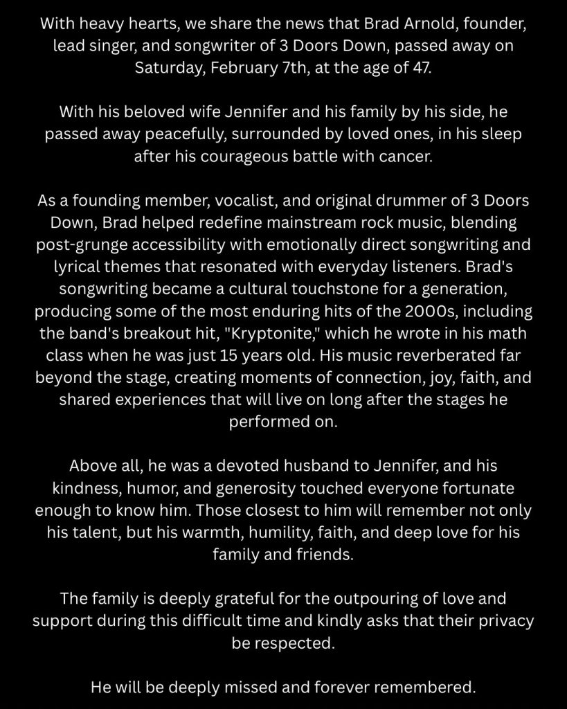 Dans un communiqué empreint d’émotion, le groupe a confirmé la nouvelle en soulignant que Brad Arnold est décédé paisiblement dans son sommeil, entouré de sa conjointe Jennifer et de sa famille. Tous étaient à ses côtés dans ses derniers moments.