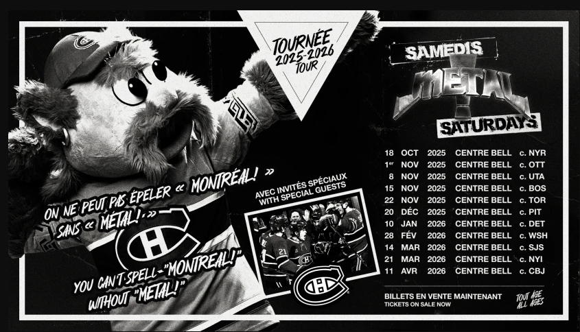Le samedi soir sera encore plus bruyant cette saison à Montréal! La mascotte non officielle des Canadiens de Montréal, METAL!, revient en force avec une série de 11 apparitions prévues lors des matchs à domicile du samedi au Centre Bell, dans le cadre de ce qu’elle appelle fièrement sa nouvelle tournée mondiale 2025-2026.