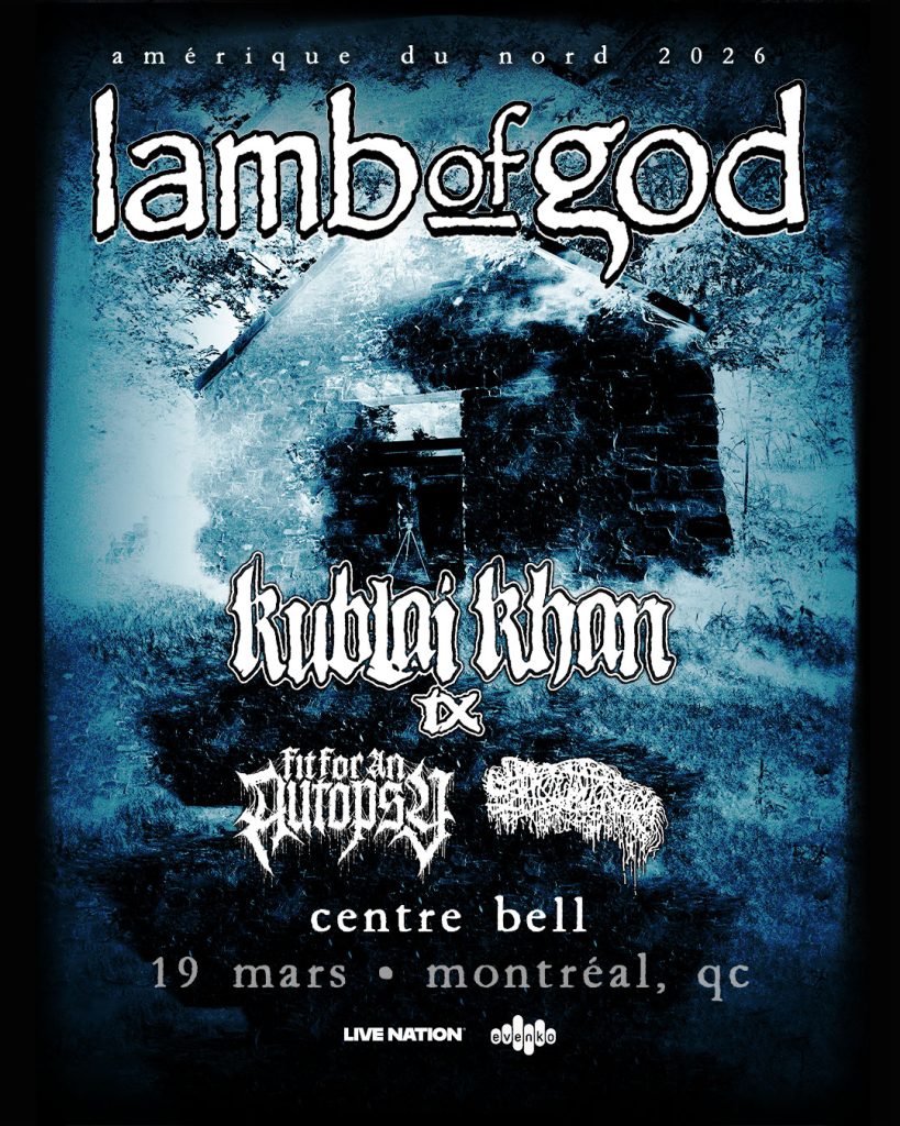 Les amateurs de metal extrême vont être servis au printemps prochain. Lamb of God vient d’annoncer une énorme tournée nord-américaine qui s’arrêtera au Centre Bell le 19 mars 2026, accompagné d’un trio de premières parties qui promettent de faire trembler les fondations de la salle. Au programme, on retrouve Kublai Kahn TX, Fit For An Autopsy et Sanguisugabogg, trois formations qui font présentement partie des plus intenses et respectées de la scène moderne.