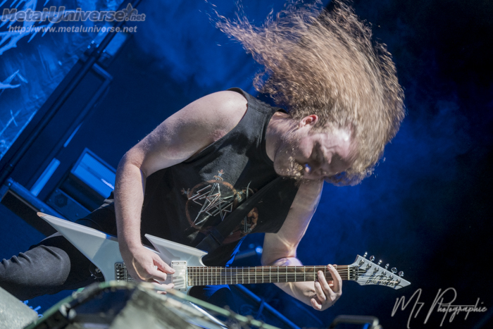 Arborant le classique chandail des Nordiques de Québec, johan Hegg entame les premières notes de The Pursuit of Vikings et rapidement, le mosh pit s’active au parterre. L’ambiance est à couper le souffle et le son est absolument parfait; les quelque 5 500 fans présents en ont déjà pour leur argent. Il faut dire que le rêve de plusieurs se matérialise sous nos yeux, soit celui de voir autre chose qu’Iron Maiden ou Metallica sur une aussi grosse scène. Tattered Banners and Bloody Flags suit ensuite, ce qui nous laisse croire que le setlist sera épique à souhait! Les musiciens se déplacent frénétiquement sur l’immense scène et semblent trouver leur compte dans une aussi grosse production. Comme si ce n’était pas assez, Guardians of Asgaard est ensuite proposée à la foule. Départ canon, s’il en est un! Hegg interagit régulièrement avec la foule entre les pièces, signifiant sa reconnaissance de nous voir en aussi grand nombre et rappelant l’affection des Suédois pour la ville de Québec. Durant Raven’s Flight, tous sautillent sur place à la demande du chanteur, qui est en plein contrôle du parterre. Les décors sont animés, changent de couleurs au gré des pièces; on n’est plus dans la même « game » que dans les petites salles, c’est clair. Blood Eagle tombe un peu à plat et refroidit un brin les amateurs mais ce ne sera au final qu’une pause bien méritée, puisque Deceiver of the Gods et l’excellente As Loke Falls remettent le feu aux poudres. Une émule un peu cheesy de Loki se promène sur la scène et engage le combat avec le chanteur, scène clairement inspirée des accrochages entre Eddie et Bruce Dickinson. Après Find a Way or Make One, les guerriers laissent place à une immense drakkar sur la scène durant Put Your Back Into the Oar et un rowing pit géant est formé au parterre. L’ambiance est géniale, malgré un essouflement de la foule à certains moments. Mention d’honneur à l’excellente War of the Gods, qui est une pièce mélodique, vive et intense qui représente à merveille tout ce qu’Amon Amarth fait de bien, puis à Raise Your Horns qui nous fait trinquer en chœur. En rappel, on a droit à Twilight of the Thunder God comme dessert, et c’est évidemment le clou du spectacle en termes d’énergie de la foule.