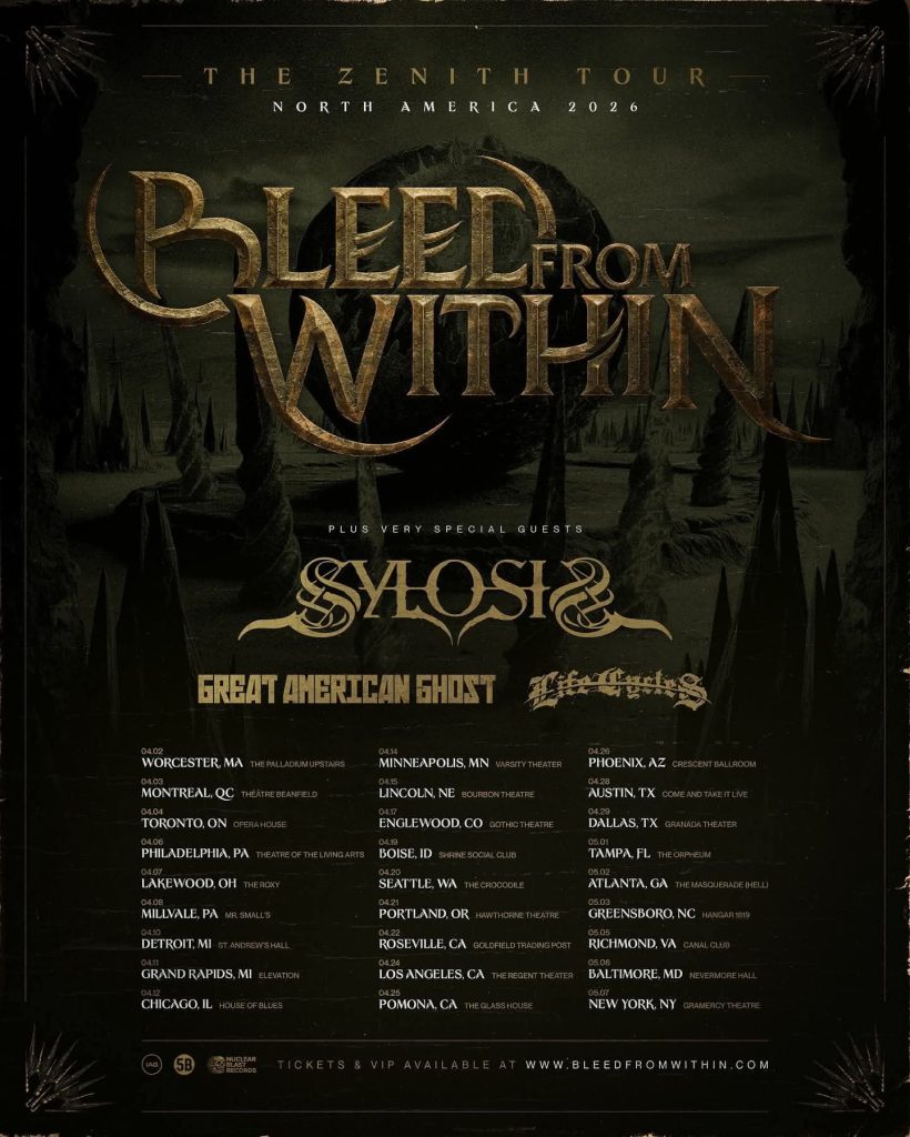 Excellente nouvelle pour les fans de metal à Montréal. Extensive Enterprise vient d’annoncer que Bleed From Within, accompagné de Sylosis, Great American Ghost et Life Cycles, sera en spectacle au Théâtre Beanfield le vendredi 3 avril 2026 dans le cadre de la tournée nord-américaine The Zenith Tour. Les billets seront mis en vente ce vendredi 21 novembre à 10 h.