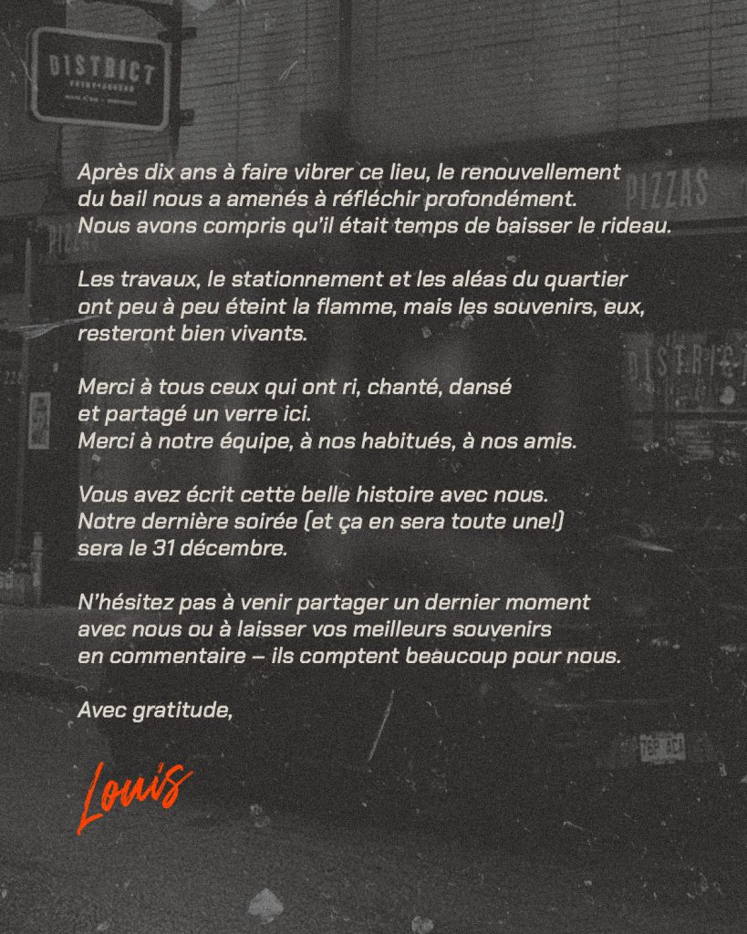 Du côté du fondateur du District, Louis McNeil (aussi propriétaire des restaurants Cosmos), la décision relève d’un choix d’affaires. Après dix ans d’activité, la concurrence accrue et les nombreux chantiers dans le secteur ont rendu l’exploitation de plus en plus difficile : « 2025 a été correcte, mais 2024 a été une année extrêmement compliquée à cause des travaux », a-t-il confié.