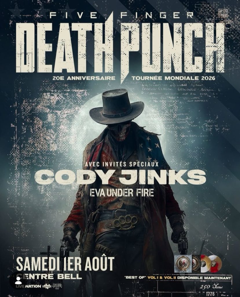 Les fans montréalais de metal moderne ont une date à encercler dès maintenant. Five Finger Death Punch sera de passage au Centre Bell le 1er août 2026 dans le cadre de sa tournée mondiale du 20e anniversaire. Cette tournée nord-américaine lancera officiellement les célébrations des 20 ans du groupe, avec en invités spéciaux Cody Jinks et Eva Under Fire.