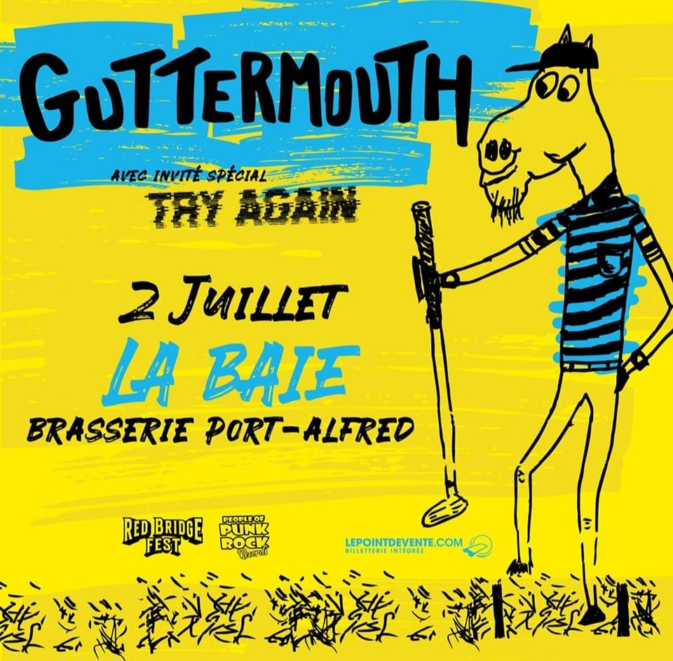 Le 2 juillet à Brasserie Port-Alfred de La Baie, il y aura de la grande visite dans la région du Saguenay Lac-St-Jean! Le groupe punk rock américain GUTTERMOUTH rendra visite à ses fans avec un spectacle qui s’annonce explosif avec Try Again en première partie. Une soirée présentée par Red Bridge Fest.