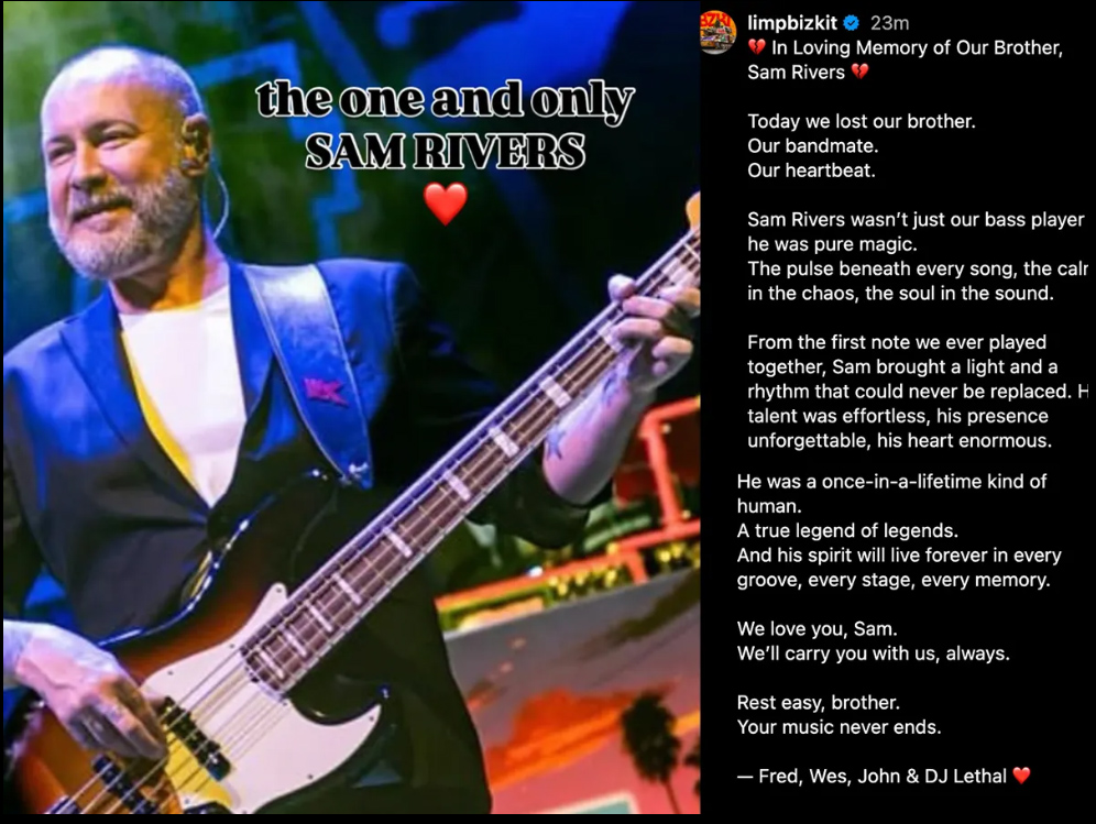 Le groupe a confirmé la nouvelle samedi sur ses réseaux sociaux, mentionnant que Sam est parti plus tôt dans la journée. Dans leur message, les membres de Limp Bizkit l’ont décrit comme leur « battement de cœur », ajoutant :