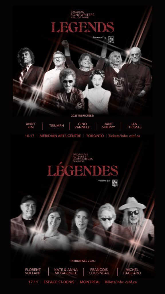 Montréal, 26 août 2025 — Le Panthéon des auteurs-compositeurs canadiens (PACC) est fier d’annoncer LÉGENDES, présentée par RBC — une série d’événements d’intronisation rendant hommage à neuf auteurs-compositeurs légendaires dont la musique a contribué à définir le paysage culturel canadien et à façonner l’univers sonore international depuis des générations. Les célébrations de cette année se tiendront à Toronto le 17 octobre au Meridian Arts Centre et à Montréal le 17 novembre à L’Espace St-Denis. Les billets pour la cérémonie d’intronisation au Meridian Arts Centre de Toronto, le 17 octobre, seront mis en vente dès aujourd’hui à 10 h HE sur Ticketmaster . Les billets pour la cérémonie de Montréal seront mis en vente le 28 août à 10h (Billets). Pour plus d’informations et pour connaître tous les détails de l’événement, visitez CSHF.ca.