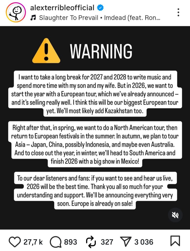 Selon un message publié par Alex Terrible sur les réseaux sociaux, le chanteur de Slaughter To Prevail a confirmé que le groupe prendra une longue pause en 2027 et 2028 afin d’écrire de la nouvelle musique et de passer plus de temps en famille. Mais avant ce repos bien mérité, l’année 2026 s’annonce massive pour STP!