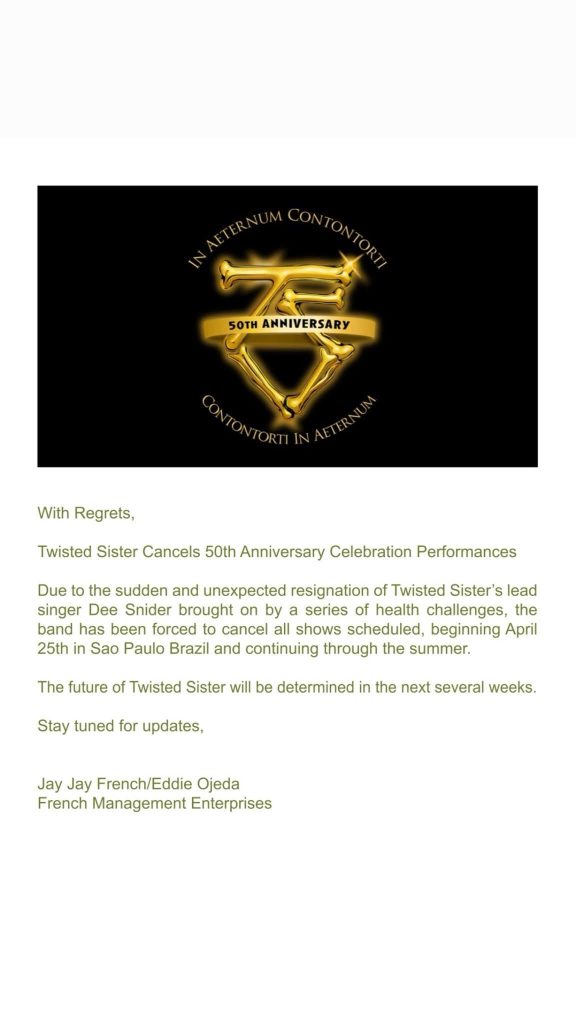 En raison de la démission soudaine et inattendue du chanteur de Twisted Sister, Dee Snider, provoquée par une série de problèmes de santé, le groupe a été contraint d’annuler tous les spectacles prévus, à compter du 25 avril à São Paulo, au Brésil, et ce, pour toute la période estivale.